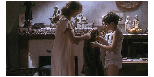 ロジェは、降りしきる雨の中、サン・トゥジェーヌにあるミュミュの家のドアのベルを鳴らす(1枚目の写真)。後で分かるが、時刻は午前4時。当然、ミュミュは寝ていたが、ベルの音で目が覚め、窓に明かりが点く。そして ドアが開き、ミュミュが顔を見せる(2枚目の写真)。「ここで、何してるの?」と訊くが、雨がひどいので、とにかく中に入れる。そして、ストーブの前まで連れてくると、「どこから来たの?」と訊く。「コレージュから逃げ出して」。「どこの?」。「ニオールのサン・ジョゼフから」。「雨の中、ニオールから来たの?」。「靴のブラシのことで、謝りに来ました。ワザとじゃありません」。「知ってるわ」。「家に帰ると、父さんに蹴られました。僕を死ぬほど殴ると、サン・ジョゼフに連れて行きました。戻りたくありません」〔同情を引くための嘘の可能性が高い(そんなシーンはなかった)。そもそも、死ぬほど殴られたら、兄から荷物など受け取れなかったろうし、激しい雨の中を数十キロも走れるハズがない/彼は定常的な嘘つきなのか?/ブラシは本当にワザとではないのか?〕。「泣かないで」。「父さんに会いたくありません」。「それは、間違ってるわ」。「悪いのは、いつも僕なんです。理解しようとしてくれません」。話を聞いてやるのも大事だが、このままでは風邪をひいてしまうので、ミュミュは、ロジェを下着だけにし、暖かいウールの服を羽織らせる(3枚目の写真)。