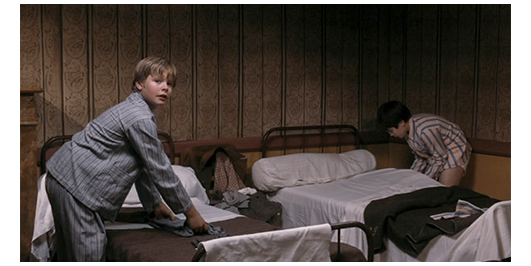 ミュミュはすぐに聞き書きを始め、ロジェのために初めから読み始める。それを書き始めたロジェは、書いた文字の上に涙が落ち(1枚目の写真、矢印)、それから後は、涙を拭うのに忙しくて字を書くどころではなくなる。司祭に会いに行ったキチガイ親父は、自分の狂った視点からロジェの欠点をあげるが、司祭は、前回、預かった時、ミュラール先生〔ミュミュは生徒達が使う蔑称〕は、好印象を持っており、私もそうだったと反論する。司祭が、刑務所を訪れた時に、キチガイ親父と友達だった男について尋ねる場面もあり、キチガイ親父の暗い過去が再び明らかになる。一方、教室では、就眠の前に全員を集めて『Avant d'aller dormir(眠る前に)』というキリスト教の歌(第一節のみ)を合唱させている(2枚目の写真)。横に立っているのは、雑用係のリベロール。ミュミュは、歌が終わると、ペルシャールという生徒に、「ロジェの世話を。バッグを運ぶのを手伝って」と頼む。ロジェが2年前にいた時にリベロールはいなかったので、さっそくペルシャールに、「彼、誰?」と訊く(3枚目の写真)。「のろまで、トンチキな監視役」。教室から出た2/3の生徒は、リベロールが止めるのを無視して真っ暗な内庭に飛び出て行く。ペルシャールは、「彼には、何の権威もないんだ。時々、ミュミュに叩かれるし。ミュミュは、食べるだけで太っちょの司祭も叩くんだ」と教え、「司祭、知ってる?」と訊く。「うん、前、ここにいたから」。「時々、すごく怒り出す。ミュミュと一緒だと楽しいよ。狂ってるから。どこから来たの?」。「サン・シャルル(St. Charles)を退学になったんだ」〔場所不明〕。「どうして?」。「僕が卑猥なことを言ったと 告げ口した奴がいたんだ」。「ひどいな。殴ってやった?」。「そんな時間なかった」。騒がしい声に、ドアを開けてミュミュが顔を出すと あっという間に静かになる。