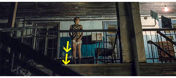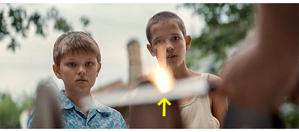 父とヴァルエーリは、早速、祖母の家(?)を出て、向かいにあるジョーリックの家(?)への階段を登る(1枚目の写真、ベランダにいるのは、口のきけない車椅子の祖父)。ヴァルエーリがドアの所まで行くと、少し年上で 上半身裸の少年が立ち塞がり、自分の人差し指を出し 「引っ張れ」と言う(2枚目の写真)。意味が分からず、ヴァルエーリが恐る恐る指を掴むと、少年は舌を出してべーっという音を出し、ヴァルエーリが変な顔をすると 「聴力検査だ」と言う〔それを聞いたヴァルエーリは、バカ笑いするが、何が可笑しいのか全く理解できないし、笑い方もわざとらしい〕。ジョーリック家の父親と娘の言い争いが聞こえ、しばらくすると、映画の中で登場回数が最も少ない父親が姿を見せ、「あんたが、ミーラとアーリックの代わりかね?」と尋ねる。「一晩だけ。もし迷惑なら…」。「何を言い出すんだね。迷惑なんかじゃない」。その時、枕を持って 娘のイルカがやって来る。イルカは、イライラした様子だが、父親は 「心配無用。イルカが用意してるから」と言い、すぐ横にあるイルカの部屋に入るよう促す〔イルカは、2人を泊めるために、自分の部屋から追い出された〕。イルカは、「ここに寝て」と自分のベッドの枕カバーを交換する。そして、「これには触らないで」と机を指す。ボリスとイルカの最初の出会いは、イルカの素っ気なさが印象的だ。一方、ヴァルエーリは少年と一緒に外に出て行くと、足踏み式の回転砥石で刃物を研いでいるおじさんがいて、2人でそれに見とれる(3枚目の写真、矢印は火花)。