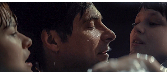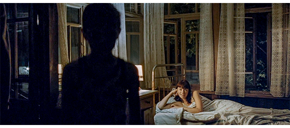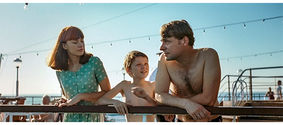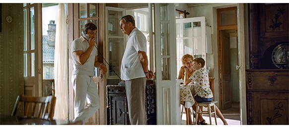 実につまらない30分の無駄なシーンの後… 翌朝。ボリスがベッドで目を覚ますと、すぐ横でイルカがにっこりする(1枚目の写真)。驚いたボリスは、「ここで何してる?」と訊く。さらに、「気は確かか? 誰かが入ってきたらどうする?」とも。「誰が来るの? 誰もいない。お祖父ちゃんは喋れないし」。この危険な申し出に、ボリスは 体を起こすと、「私は大人で、君は…」と言いかけ、「私にはできない」とはっきり断る。イルカは、怒って部屋を出て行く。この椿事はボリスにある決心を促したようで、次のシーンでは、階段を駆け下りてきたヴァルエーリが、ジョーリックの息子に、「これから船に乗るんだ」と、興奮して話す(2枚目の写真)。ジョーリックの息子は、よほど “他人に興味がない人間” なのか、「それがどうした? オレは、これから爆発の準備だ」としか言わない。次の場面では、ボリスが、「また来年」と言ってジョーリックと握手し、岳父がスーツケースをくれる。ボリスは、ジョーリックの父(イルカの祖父)の前に立ち止まると、「さようなら」と声をかける。老人は、意味不明の言葉を発しようとしたが、髭を剃っている最中なので、イルカが、「お祖父ちゃん、じっとして」と黙らせる。