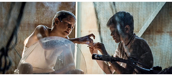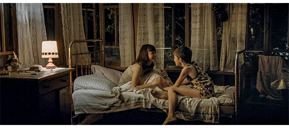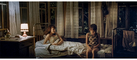 「何の真似? 誰にも言わないから。この家にトイレがないの忘れたの? 中庭でするのよ。冬だと どうなると思う? すっごく寒いから、走るのよ」。その最後の言葉で、ヴァルエーリが笑顔になる。イルカは、「ママは来ないの?」と訊く。「ううん」。「ママなしで過ごすのね。でも、そんなの大したことじゃない。私には、ママがいないのよ」。「なぜ?」。「出てったの」。「どこへ? うんと遠く。あんた、パパとママ、どっちが好き?」。ヴァルエーリは 大きく首をすくめる。「さあ」。「男の子はママ、女の子はパパよ。あんただったら、なおさらね」。「どうして?」。「何もかも揃ってる。素敵じゃない」。「でも、モスクワに帰っちゃう」。「どこにも行けないわ。オデッサからは、誰一人出られないの」。「どうして?」。「全員が感染してるから。ママにうつしたくないでしょ?」。「僕、感染してないよ!」。「ちゃんと してるわよ。あんたのパパも、他のみんなも死んじゃうわ」。「君は?」。「私もよ」。イルカは、ヴァルエーリのそばに寄ってくる。「想像できる? 町中が死んじゃうの。夜、町に行っても、誰一人いない。すると、後ろから忍び寄った死人が(1枚目の写真)… 『心臓を寄こせ!』」。ヴァルエーリが悲鳴を上げ、イルカが口を押える。「大声で叫ばないで。みんな寝てるのよ。怖かったの?」。「ううん」。「嘘!」。「嘘じゃない」。「恐怖ね」。「違う」。その頃には、笑顔でのやり取りになっている(2枚目の写真)。朝、父が起きて来ると、ヴァルエーリは、イルカのベッドで一緒に寝ていた〔この映画が、12歳と16歳の恋だと良かったのに…〕。