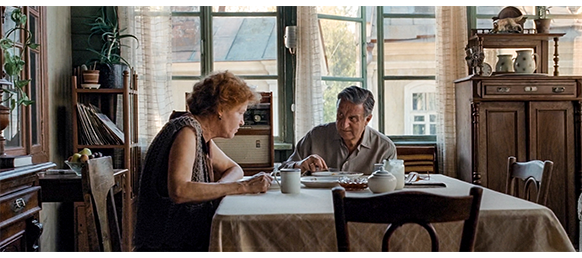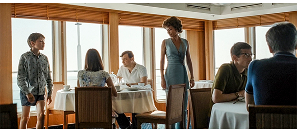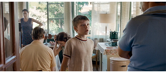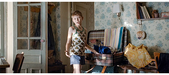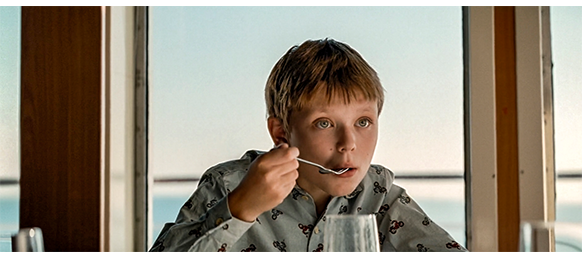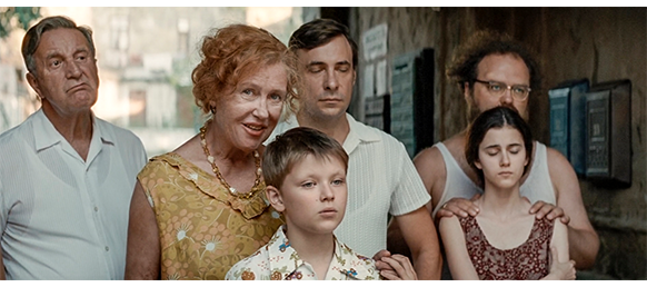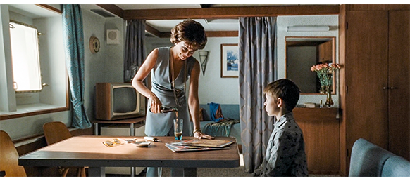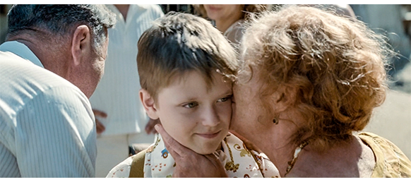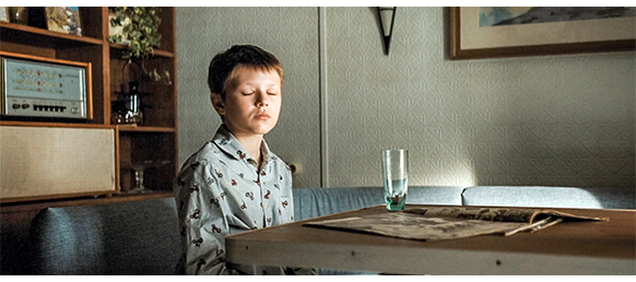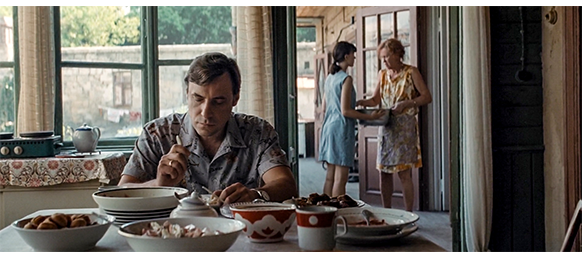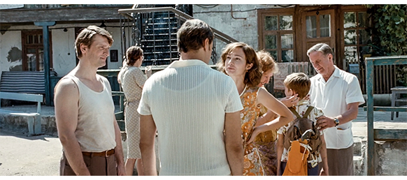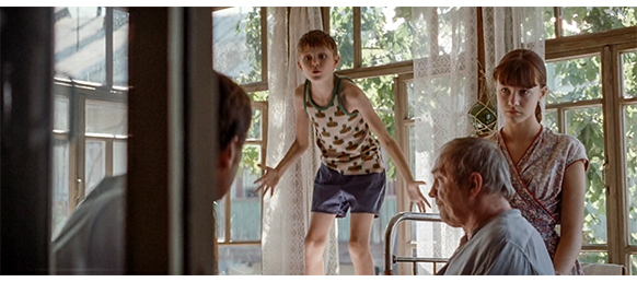 海のシーンが突然終ると、いつもの悪い癖で、延々と祖母の部屋の無意味な映像が流れる。この無言のシーンで分かるのは、家(?)には、祖父以外に誰もいないらしいこと。1分以上も祖母の調理映像が続いた後〔3人が海に飛び込んだ重要なシーンは1分以内〕、ようやく祖父と祖母が食卓で食事を始める。2人の間に交わされる会話は、次の6行だけ。祖母:「アロチカとボーリックは、ヴァルエーリにドイツ語を習わせるそうよ」(写真)「あんた、クリーム要る?」「もし、彼(ヴァルエーリ)がイディッシュ語〔中・東欧のユダヤ人の間で話されていたドイツ語に近い言葉〕を習ってたら、ドイツ語を習う必要なんかなかったのにね」。祖父:「ニワトリを包めよ。ナスとマルメロ〔西洋かりん〕と一緒に、車掌から渡してやれる」「ありがたいことに、コレラは収まった。汽車が動き始める」。映画は、ここで終わるが、一体3人はどうなったのだろう? 祖母の言葉から、ヴァルエーリの母は、夫のことを許し、許す以上は、イルカはモスクワには行かないのであろう。そして、ヴァルエーリと父は、飛行機ではなく汽車でモスクワに向かう… らしい。だが、どうしてそのような結果になったのだろう? イルカはどうなるのだろう? 不満の一杯残るエンディングだ。当然のことながら、エンド・クレジットが終わった後のサプライズ映像もない。