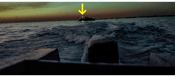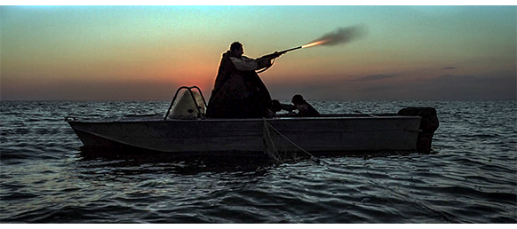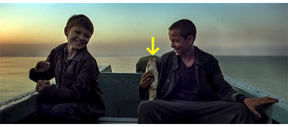 場面は、いきなり日が暮れかかった黒海の上。ジョーリックが操縦するモーターボートに、彼の息子、ボリスとヴァルエーリの4人が乗り込んで、暗い海面を疾走する(1枚目の写真)。ボートは、7本の木の棒が円形に刺してある中に停泊すると、予め仕込んであったのか、ジョーリックが引き揚げる網には、魚が一杯入っている。息子は、魚を1匹手に取ると、ヴァルエーリに口の中を見せ、「歯が一杯だろ。噛みつかれるぞ」と怖がらせる(2枚目の写真、矢印は魚)。「向こうにやってよ」。すると、いきなりサイレンが鳴る。そして、拡声器で、「ボートの乗員に告ぐ。ロープを投げろ」と命令される。ヴァルエーリは、「パパ、あれ何? 軍隊?」と訊く。ジョーリックは、拿捕されるのを嫌い、エンジンをかけると、3人に伏せるよう命じ、相手の船に向かって一発撃つと(3枚目の写真)、全速で逃げ出す。