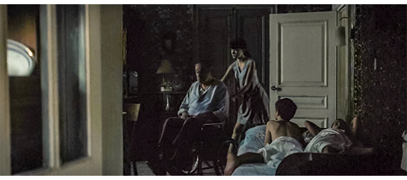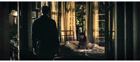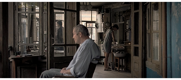 イルカは、祖父を、①ヴァルエーリがジョーリックの息子と一緒に寝ていた部屋、②玄関のある居間兼食堂の部屋、③臨時にボリスが使っているイルカの部屋、まで押して行くと、そこに車椅子を止める。そして、魚の鱗を取り始める(1枚目の写真、祖父の向こうに見えるのはボリス)〔この構図を示したのは、祖父には、“イルカのいる部屋で起きていることが見える” と言いたいため〕。イルカの作業を見ていたボリスは、彼女の背後に寄って行く。すると、イルカは突然作業を止め、振り向いて ボリスにキスする(2枚目の写真)。ボリスも、拒否せずに それに応える。すると、それに気付いたのか、祖父が変な声で叫び出す〔口はきけないが、意味不明の音を出すことはできる〕。イルカは急いで飛んで行く。車椅子の角度が若干斜めになっていたので、キスを見た可能性は高い。イルカは、車椅子の向きを窓に向け、「お祖父ちゃん、大丈夫だから 心配しないで」と声をかける。