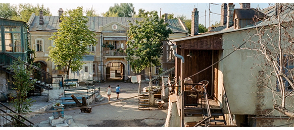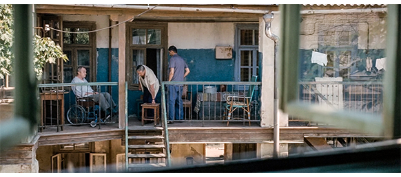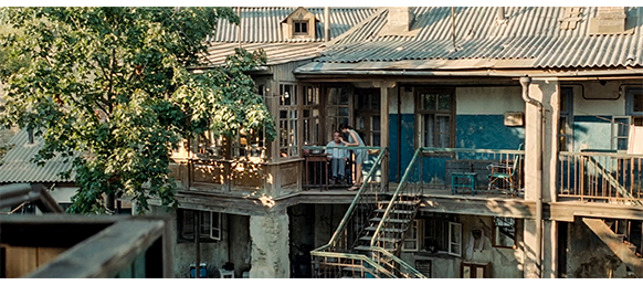 その直後のシーンは、ヴァルエーリの祖父母の家での、父と一緒の朝食(1枚目の写真、手にしているのはパン)。後ろでは、ミーラが祖母と話している。「ママ、パパはどこ?」。「外出」。「どこへ?」。「知るもんかね。寝てる間に 出てったから」。ヴァルエーリは 食事の途中で席を立つと、「出かけてくる」と父に言い、ドアから出て階段を降りて行く。入れ替わりに、イルカが、昨夜獲った魚をさばいたものを金盥(たらい)に入れて持ってくる(2枚目の写真)。ボリスは、彼女が出て行くと席を立ち、向かいの階段を上がって行くのをじっと見ている。イルカはベランダまで行くと、車椅子の祖父に、「お祖父ちゃん、何か欲しい?」と訊く(3枚目の写真、これはボリスの視線なので、両家の位置関係がよく分かる)。ボリスの視線を見たミーラは、「涎(よだれ)なんかこぼさないで。あの子、まだ15よ。女性なら、ここにいるでしょ。分かってる?」と冷やかし、さらに、「私は、あの年の頃、どんな人と一緒になるんだろうってことばかり、考えてた」と付け加える。「アーリックよりいい奴はいなかったのかい?」〔ボリスは、シオニストのアーリックが好きではない?〕。「いたわ。ボリス、年上の伯母のこと どう思ってるの? 目下、一時的に独身でしょ?」。この変な誘いは、最低のヴォロージャが、シャツとパンツだけで現れたことで終わりとなる。