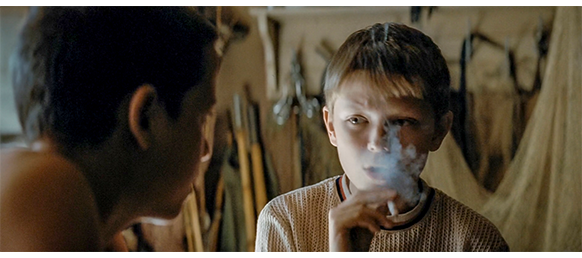 先ほどのシーンでは、ボリスがタバコを吸い、ミーラが1本せがんだが、それを受けて、次のシーンでは、ジョーリックの息子がタバコを吸い、それをヴァルエーリにも吸わせようとする(1枚目の写真)。ヴァルエーリは、最初咽(むせ)たが、2回目は普通に煙を吐いたので(2枚目の写真)、初体験とは思えない。それを見た妹が、「喫煙は健康に悪いのよ」と注意する(3枚目の写真)〔WHOがタバコと健康に関する最初の決議を行ったのは、ちょうど1970年の総会。そんな時代に、10歳くらいの少女がこんな発言をするだろうか?〕。因みに、このシーンは、映画開始後50分40秒。次にヴァルエーリが登場するのは、1時間19分10秒。約30分の長い空白が続く。