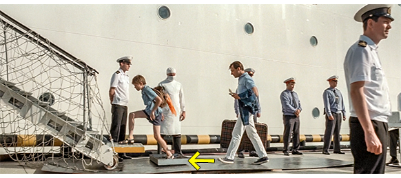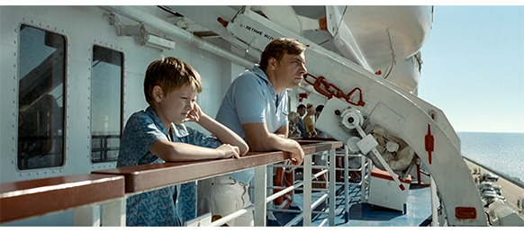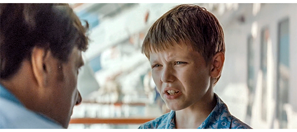 乗船用の長いタラップの手前には、靴底の消毒用の台が置かれている。ヴァルエーリは、しっかりと中に踏み入れると、次のステップまで足を拡げて上がる(1枚目の写真、矢印は台)。そのままデッキの手すりにもたれた2人だが、ヴァルエーリの顔は冴えない(2枚目の写真)。「お祖母ちゃんに会いたくない?」。「さよなら言ったじゃないか。ここが済んだら 空港に直行だぞ」。「行きたくないよ。ここで、やることがある」。「どんな?」。「いろいろだよ。まず、お祖母ちゃんに会う」。父は、「モスクワには帰りたくないのか?」と訊く。「帰って、何するの?」。「ママがいる」。「こっちに来ればいい」(3枚目の写真)「モスクワに帰っても何もない。こっちには、みんないるじゃない。イルカだって」。このヴァルエーリのワガママが、折角大事に至らなかった父とイルカの関係に火を点けることになろうとは…