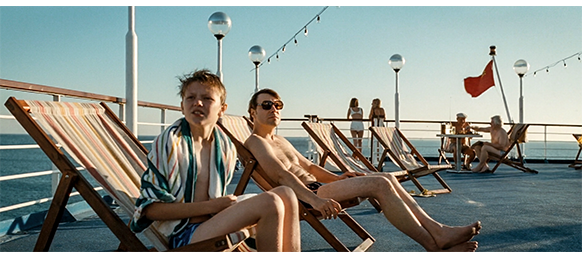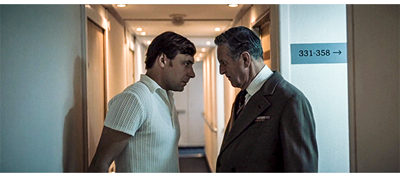 前のシーンで、ボリスが「私もだ」と言った後、映画では、オデッサの祖父母の家(?)に切り替わる。一家が食事をとっていると、向かいの家からジョーリックがやって来て、「イルカはどこだ? ボリスはどこだ? 2人を探し出して罰してやる」と凄む。祖父は、ジョーリックと一緒に家に行き、口のきけない車椅子の老人の前に座椅子を置いて腰を下ろす(1枚目の写真)。そして、「もう起きちまったことだ。変えられん」と話しかける。誤解を招いた張本人の老人は、不満そうに喚く。祖父:「わしのせいだ。わしら全員が有罪だ」。また、不満そうに喚く。祖父:「何が言いたいか分かるかね? わしらは生き続けねばならんのだ。監獄に入れるのが 最良の策なのか?」。老人は、何も言わずに息子の顔を見つめる。祖父:「ボリスは、二度と来んし、あんたが会うこともない」。三度目、不満そうに喚く。祖父:「イルカか? わしが連れ戻し、医大に入れる」。老人は、それで一応満足する。検疫船では、女性とヴァルエーリの “サプライズ” の後、ボリスの部屋がノックされ、オフィサーが訪問者を連れて来る。岳父だ(2枚目の写真)。岳父:「入っても?」。ボリスは中に入れる。そこには、当然、イルカもいる。「お祖父ちゃんが寂しがってたぞ。家に帰ろうな」。ボリスは、「彼女は、どこにも行かない」と拒否し、その理由として 「父親に何をされるか分からん」と言う。祖父は、イルカに向かって、「父さんが何をするって? 指一本触れんさ。父さんのことは心配するな。本人がそう約束した。お祖父ちゃんの希望だ」と懐柔する。一方、ボリスには、「母さんと私は、何もなかったことにする。お前とヴァルエーリはここから出たら、飛行機でモスクワに帰れ」と言う。しかし、イルカは、ボリスに向かって、「私、家には帰らない。あなた約束したでしょ」と訴える。岳父は、「『約束』した? 何をしたんだ?」と詰問する。ボリスは、ドアを開けて岳父を廊下に出す。そして、船室から十分に離れると、「何もなかったんだ。分かるか? 何一つだ」と、正直に話す。「何もなかったとは素晴らしいことだ。イルカが出てきたら、家に帰ろう」。この後の会話も意味が分からない。ボリスの話を信じ、なおかつ、このまま明日まで留め置くことの有害性を説く岳父に向かって、ボリスは、「帰ってくれ」とだけ言い、岳父をその場に放置して船室に戻る〔ボリスの意図が理解できない~脚本の不味さ〕。