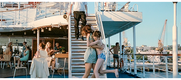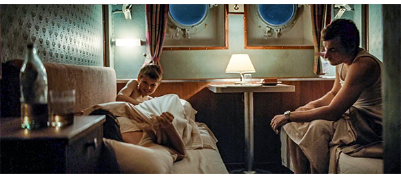場面は急に変わり、ヴァルエーリがプールで泳いでいる〔この映画、何度も言うが、つまらない会話には時間を割くが、場面転換は急過ぎてよく理解できない。夜家を出ても、検疫船が受け付けているとは思えないので、ホテルで1泊したのだろうか? 何れにせよ、プールのシーンは翌日だ〕。検疫中なら、コレラの感染者がいる可能性もあるわけで、そんな中で大勢がプールに入っているのは危険としか言いようがない。プールを出た後、ヴァルエーリは父の隣のデッキチェアに座り、渡されたバスタオルで体を拭く。その最中に、父が、「誰が来たか見てみろ」と言い、ヴァルエーリが見上げるとイルカが階段を降りてくる。ヴァルエーリは飛んで行って抱き着く(2枚目の写真)。2人が喜び合っている時、イルカを連れてきたオフィサーは、父のチェアまで行く。父:「ありがとう」。オフィサー:「お約束通り」。そして、そのまま欄干まで行くと、父はオフィサーにお札を渡す〔父とイルカの間に、いつこのような取り決めがなされたのだろう?? 映画の中で最も重要なシチュエーションでありながら、何の説明もないのは卑怯としか言いようがない〕。オフィサーがいなくなった後、ヴァルエーリはイルカを連れて父の横に来て、「彼女、一緒にいるの?」と尋ねる(3枚目の写真)。「夜は一緒の部屋だ」。その言葉に、内情を知らないヴァルエーリは、飛び上がって喜ぶ。父は、「彼女は、私の妹ってことになってるからな」と、注意する。「叔母さんって呼ぶんだ」。船室では、ベッドが2つしかないので、ヴァルエーリとイルカが逆向きになって寝る。2人は、電気が消されるまで、ふざけ合う(4枚目の写真)。暗くなった後、ボリスとイルカは、ベッドに寝たまま 見つめ合う〔イルカは逆向きに寝ているし、ベッドの間には通路もあるので、距離はかなりある〕。