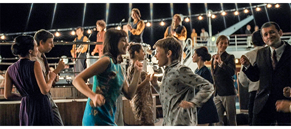 その夜、船の上では大勢の人がダンスに興じているが、とてもコレラの検疫船上とは思えない行為だ。まず、ヴァルエーリとイルカが楽しそうに踊る(1・2枚目の写真)。しかし、そこに父がやって来て、「ヴァルエーリ、寝る時間だ」と言い、腕時計を見せる(3枚目の写真)。時間を見たヴァルエーリは、仕方なく船室に向かう。