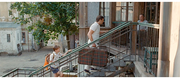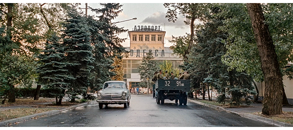 タクシーのドライバーは、スーツケースのためにトランクを開けながら、「どこから来たんだね?」と訊く。「モスクワから」。ドライバーは、ヴァルエーリに、「ママは一緒じゃないんか?」と尋ねる(1枚目の写真)。「ママは、2日後に来るんだ」。父は助手席に、ヴァルエーリは後部座席に乗って、いざ出発。タクシーがターミナルから出て行くと、代わりに軍用車両2台がターミナルに向かって行く(2枚目の写真)〔ターミナルを閉鎖するため〕。ヴァルエーリは、19世紀の石造の低層建造物が残るオデッサの街並みを見ている〔懐かしそうなのか、物珍しそうなのかは、祖父母の家を尋ねる頻度によるが、1年前にも来たことがすぐ後で分かるので、前者の方〕。