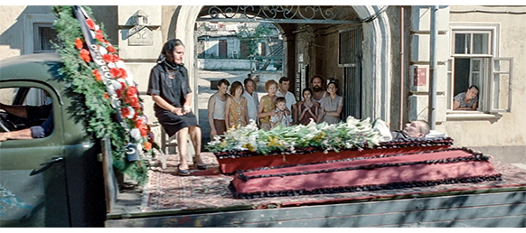 祖父が、スーツケースを持って2階に運んで行こうとした時、表の通りから葬送行進曲が聴こえてくる。全員が、敬意を表しに通りに出て行く〔2階建てのアパートらしき建物群は、通りから引っ込んだ内庭に面している〕。ボリスが来ても階段を降りることさえしなかった怠惰な2人も、一緒に見に行く。通りでは、4人の楽師を先頭に、花で覆われた棺を1つ乗せたトラックが続く(1枚目の写真)〔死者は 共産党のお偉方?〕。ヴォロージャは、ショパンのピアノ協奏曲第2番ロ短調の第3楽章だと指摘する。ヴァルエーリも、それを、物珍し気に眺めている(2枚目の写真)。ヴァルエーリは、「パパ、僕はいつ死ぬのかな?」と、変な質問をする。すぐ後ろにいる父は 「死なない」と答える。「でも、もしコレラにかかったら?」。「手をよく洗って、爪を噛まなきゃ大丈夫」。祖母は 「心配しないで。すぐには死なない。最初にお祖父ちゃんとお祖母ちゃんが死に、それから、ローラ伯母さんとヴォロージャ伯父さん、それから、ミーラ伯母さんとアーリック伯父さんが死ぬわ」と言う(3枚目の写真)。ヴァルエーリは、「パパ、ママ、それから、ジェンカだね?」と、その後を続ける。ジェンカは、すぐ 「私は死なない」と反論し、ヴァルエーリの父は「誰も死なない」と、変な会話を収める。