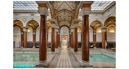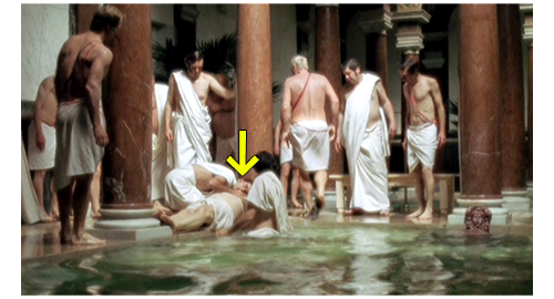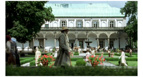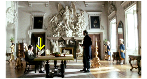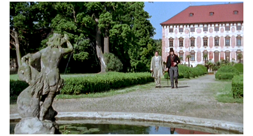 この後の数節についての原書の記述。【第49章  ❾ブラウンロウ:「自分の利益と権勢を強固にするために、お前のお父さんを犠牲に供した例の金持ちの親戚の一人がとうとう死んでしまい、自分がもたらした不幸のつぐないにと… 金をお父さんに遺した。この男はローマへ保養に出かけてそこで死んでしまったので、めちゃくちゃになった残務の整理にために、お父さんはすぐにローマへ出かけねばならなくなった。ところが行った途端に死の病にとりつかれてしまった。その知らせがパリに届くやいなや、お前の母親がお前を連れて急行した。母親が着いた翌日お父さんは亡くなったが、遺言書はなかった。そこで、その全財産は母親とお前の手に渡った。エドウィンが、リチャード伯父のいるローマ浴場に向かう(1枚目の写真)〔このロケ地は、ローマではなく、チェコの首都プラハにあるLetohrádek královny Anny(アニー女王の夏の宮殿、1538–1560年)(2枚目の写真: 捜すのに苦労した)〕。エドウィンは、ローマ浴場の中に入って行き、付き添いの医師に、「伯父は、ずっと ここに?」と質問する。「ええ」。「長くない?」。「長くは…」。それだけ訊いてから、エドウィンは、「リチャード伯父さん。エドウィンです」と声をかけてから、伯父の隣に入る。伯父は、すぐに、「金のことだ。知って欲しい。わしを怒鳴ってもいいが、咎めんでくれ。十七の子供を結婚させてしまった。よりによって、あんな悪女と。それに、あの子… ああ 神よ…」(3枚目の写真、矢印は巨大な肉腫)。エドウィンは、「理由の如何に係らず、わが子なのです」とエドワードについて話し、次いで、話をアグネスの方に持って行こうとして、ふと伯父を見ると、湯の中に浮いて苦しんでいる。急いで助け出し、助けを呼び、数人で湯から出し、医師が心拍を調べる(4枚目の写真、矢印は医師)。「私は 『長くは』 と言いましたが、僅か五分とは」。上記の原作の太字の部分が、映画化にそのまま活かされている〔因みに、このローマ浴場は、プラハの西約120キロにある温泉保養地Mariánské Lázně(マリアーンスケー・ラーズニェ)にある1896年に作られたローマ浴場(5枚目の写真: 捜すのに苦労した)〕