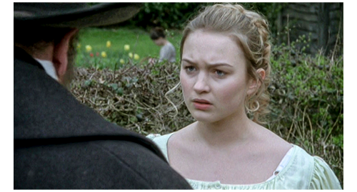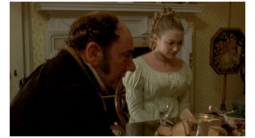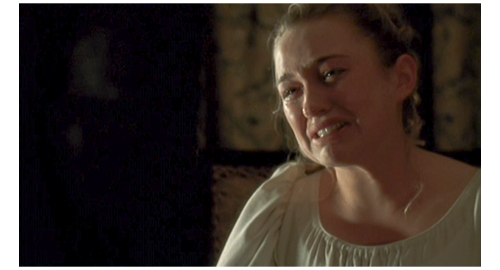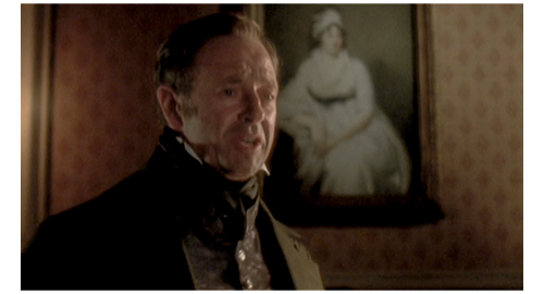 一方、鬼女とエドワードは、フレミング一家が隠れ住んでいる田舎家まで、馬に乗って偵察に行く。フレミング邸の住所は、エドウィンの最後の手紙に書いてあったが、落ち延びた先は どうやって見つけたのだろう? 原作でも、前に引用した第51章の❼の 「娘の父は恥と不面目でいたたまれなくなって、二人の子供を連れてウェールズの辺ぴな片田舎へ夜逃げをして、友達に逃げた先がわからないようにと、自分の名前まで変えてしまいました」という状況でも、この二人は行き先を見つけ出しているが、どうやったのかは書かれていない。最初はアグネス一人が狭い庭に出てきたが、すぐに使用人も現れたので、鬼女は 「今夜、もう一度 来ましょう。目立たないように」とエドワードに言う。エドワードは乗っていた馬の性別を間違え、それが原因かどうかは分からないが落馬し、それを見ていた使用人は、「都会の連中でしょうな。間違いなく。大嫌いなんでさ。どうせ、強盗か泥棒、作家か読書家だで」と言い、アグネスが笑う。そこに、フレミング氏が外出から戻って来て、アグネスと一緒にいたローズに、「お姉さんに話があるんだ、ローズ。二人で」と、追い払う(2枚目の写真)。アグネスは、また責められるのかと思いきや、父は、「実に、言いにくい… いつもの話題とは、全く違うことだ。できれば、こんな話題は口にしたくなどなかった」と言い淀む。「お父様、どうなさったの? 大丈夫?」。「たった今、わが良き友エドウィンがローマで死んだと聴かされた」(3枚目の写真)「殺されてな… そう 殺人だ。刺されて盗まれた。お前に与える衝撃が、わしほどひどくないといいが。お前とローズは、リーフォード氏が好きだったからな」。前に引用した原作の第51章の❺の 「娘の父親には母から真相を書き送ってやりました」とは、状況は全く違う。この、思わぬ悲劇を聞いたアグネスは、父が家に入ると、野原の方に駆けて行き、あまりのやりきれなさに悲鳴を上げ、それをローズが聞いてしまう。