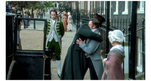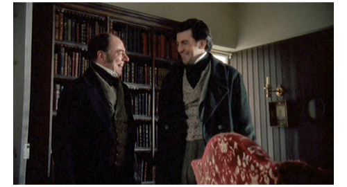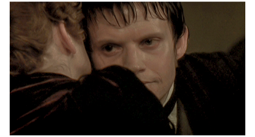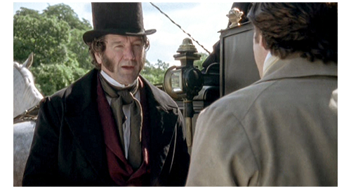 ここで、もう一度、昨夜に戻り、ブラウンロウ邸での続き。エドウィンは、自分の過去の結婚のことを話し始める。「僕は、結婚したくありませんでした」。「知っている。だが、君は そうした」。「僕は、たった十七だったんです。あなたは僕の付き添い人。なぜ、止めてくれなかったんです? なぜ、父や伯父を諌めなかったんです?」。「付き添い人の役目は、結婚を止めるのではなく、むしろ、その逆だ」〔これは、ある意味、卑怯な逃げ。結婚に反対なら、付き添い人を引き受けずに、推進者を諫めるべきだった〕。「でも、あれは卑劣な策略だったんですよ。政略結婚。家同士の商売のための犠牲。愛の全くない」(1枚目の写真)。ブラウンロウは、やや相好を崩した顔になる。それが気に障ったエドウィンは、「なぜ、笑うんです? 滑稽でロマンチック過ぎますか? 僕が嘘を付いてるとでも?」と批判する。「疑ってなどいない。長い付き合いだから。それに、君を知る前から、君のお姉さんを知っていた。私にとって、夢と幸福の時期だ。だから、笑ったんだ」(2枚目の写真)。原作の 【第49章 ❶ブラウンロウ:「お前〔モンクス〕のお父さん〔エドウィン〕の昔なじみの友達だからこそ、こうしているんだ… お前のお父さんがまだ少年だった頃、しかもそのたった一人のお姉さん〔キャサリン・リーフォード〕が、わしの新妻になる筈だった――が、神様はそれを許して下さらなかった が、この言葉と合致する。2枚目の写真の背後の絵は、エドウィンの姉、ブロウンロウの妻になる前に亡くなったキャサリンの肖像画だ。ブラウンロウは、当時のキャサリンに対する愛と比較し、「今、君が感じている愛、その情熱が懐かしい。まだ若かりし頃に味わった、あの身震いするような感覚が」と、ある意味、エドウィンに同情する。そして、翌朝、家の前に停まった馬車の前で、エドウィンはブロウンロウに心からお願いする。「戻ったら、身辺は整理します。それから、再出発です。アグネスと。妻と、息子には財産を分与してやります。十分 暮らしていける額の。手紙にも、そう書いておきました」。そして、さらに、「もし、僕に何か起きたら… あり得ないことですが…」。「アグネスと子供だな」。二人は抱き合って別れる(3枚目の写真)。ここでも、エドウィンだけでなく、ブラウンロウも、「アグネスと子供」だと、はっきり認識している。これは、先の 第49章の❿の「一人だけで逃げ出すつもりでないことは、わしには充分見当がついた。しかし、それ以上の詳しいことは打ち明けてはくれなかった」とは、全く違っている。