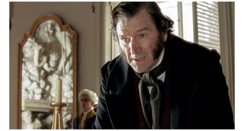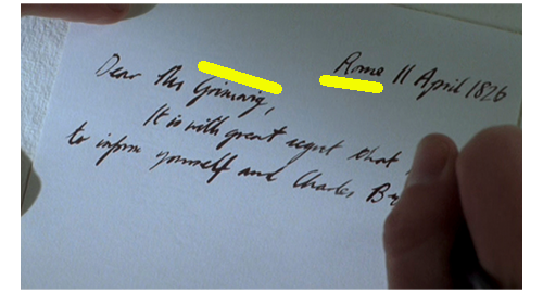 ここで、映画では、かなり前に戻るが、グリムウィグが改めてブラウンロウ邸に行き、ローマからの手紙を渡すシーンがある(1枚目の写真、矢印)。しかし、ブラウンロウは、「遺憾だ。お気に入りの数少ない友人を亡くすのは… だから、来たのかね?」と訊くので、ローマの弁護士からの手紙を既に読んでいたことになる。次に、ブラウンロウが手紙を読んでいる短い場面が入るが(2枚目の写真、矢印)、何を読んでいるのだろう? 先に、ローマで、弁護士が、「リーフォードさん。グリムウィグ、ブラウンロウ両氏には、郵送しておきます」と言っていたので遺言書は届いているハズだし、訃報を知っているということは、弁護士がエドウィンの死後グリムウィグに出したのと同じ手紙も受け取っているハズだ。そして、オリバーの命名後に、次のシーンが入る。夜だというのに、ブラウンロウが、グリムウィグの強い反対を押し切って馬車で出かけようとする。グリムウィグ:「それは、決して良いこととは言えません」。ブラウンロウ:「私は、良い人間じゃない! どいてくれないか」。ブラウンロウは、エドウィンが残していったアグネスの肖像画を手にし、大きな革鞄を持って出て行こうとする。「まともな人間なら、夜に旅行などしませんぞ。賢明な人間なら、朝まで待って、行き先も確定すべきです!」。ブラウンロウは、それを無視して家から出る。「止めることは諦めましたが。でも、どうして肖像画を持って行くんです?」。「Time Pessima Paratus Esto〔ラテン語〕。私のモットーだ。最悪の事態に備えよ」(3枚目の写真)「帰ってくれ」。「じゃあ、ご幸運を」。「不屈な男には、幸運など不要だ」。