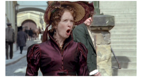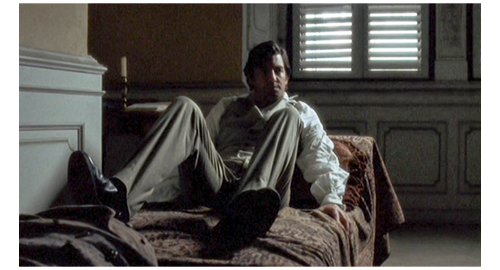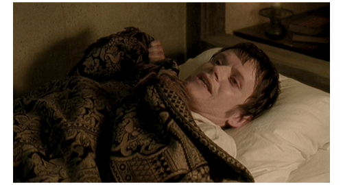 その夜、エドウィンは、弁護士が 「私なら、泊まりませね」と言った安宿に泊まる。そして、白ワインを飲みながら遺言書を見、「最愛の、アグネスへ」と、手紙を書き始める〔手紙の内容は不明〕。そして、書き終わるとベッドで寝てしまう。そして、朝になり、どこかおかしいので横になったまま部屋を見ていると、テーブルに誰かが座っている。そして、上を見ると、最悪の妻エリザベスが、「手紙をありがとう、エドウィン」と言う。エドウィンは、「手紙は出したが、招いた覚えはない」と言い返すが、ここで疑問が一つ。手紙はリーフォード邸から出したもの。その中に、ローマのホテル名を書くはずがない。エリザベスは、夫がここに泊っていると、どうして分かったのだろう? 原作では、第49章の❾の「ところが行った途端に死の病にとりつかれてしまった。その知らせがパリに届くやいなや、お前の母親がお前を連れて急行した」のように、ローマから知らせが届いたので矛盾はない。映画は、この点が甘い。その時、エドワードが、「父さん。だいぶ 良くなりました」と声を掛けるが、エドウィンは無視(1枚目の写真)〔この時期の “モンクス” は、どう見ても悪い青年ではない。彼を無視続けるエドウィンの方が悪く見えてしまう〕。エリザベスは、「ありがたく思うことね、エドウィン」と言う。「何を?」。「あたしが、ここにいてあげることを」。「不幸の最中にか?」。「あなたの優しい親切な伯父様は、あたし達に惜しげなく遺してくれた」。「辞書には君の名が載っている、エリザベス。“邪悪” を表現するのに これほど相応しい言葉はない。“悪意” も ぴったりだ。どうやって入り込んだ?」。「とても簡単よ。ここは、相応しい場所じゃない。あなたのような成金さんには」。エドウィンは、テーブルの上に置きっ放しになっていた遺言書を手に取ると、「これを読んだんだろ?」と訊く。「長いこと眠ってたでしょ。この部屋にある英語の書き物は、それしかなかったのよ。あなたの手紙は別として。書き出しは… 最愛のアグネスへ… ロケットは、できる限り心臓の近くに…」。「遺言書と手紙で分かっただろう。話そうと思っていたより、はっきりと。これで、君に話す手間が 省けたという訳だ」。「あなた、自分一人が苦しんだと 思ってるの? あたしの一族は、無理やり “坊や” と結婚させた。あたしには、死の床で後悔してくれるような金持ちの伯父などいない」と泣きながら話す(2枚目の写真)。エドウィンは、「聞き飽きた。辞書に追加だ。“欺瞞” とはエリザベスだ」。嘘泣きをやめたエリザベスは、「手紙を受け取った時、エドワードに言ったのよ。ここに、来るべきだって」と平然と言う。エドワードは、テーブルの上に置いてあった白ワインのデキャンタを持つと、父のグラスに注ぎ(3枚目の写真、矢印はデキャンタ)、エドウィンはそれを飲む。