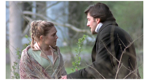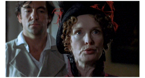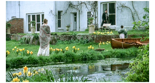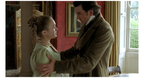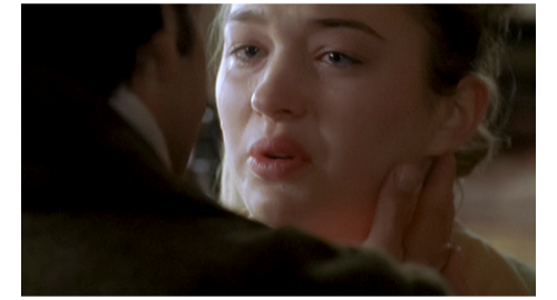 ダブリンから帰国したエドウィンが、二頭立ての馬車で邸宅に帰って来る(1枚目の写真)。邸宅の遠景映像はないが、門があり、そこから邸宅まで数十メートルの庭があり、専属の庭師もいるので、かなり裕福な暮らしぶりと思われる。迎えに出て来たのは、マシューズという秘書のような使用人。「留守中、何か?」。「変わったことは、何もありません。でも、来客がおいでです」。「歓迎すべき人?」。「ミス・フレミングです。客間にお通ししてあります。その前に2通の至急便を お読み下さい。ローマからと、パリの奥様からです」。「私に、妻などいない」。「ミス・フレミングは、たいそう取り乱しておられます」。エドウィンは、至急便は後回しにし、すぐにアグネスのところに駆け付ける。「アグネス! 手紙は、受け… どうした? 君は… いったい…」。「話に割り込まないよう、躾けられたの。赤ちゃんが できたの」(2枚目の写真)。それを聞いたエドウィンは、「僕は… その… つまり…」と言葉に詰まった後で、「アグネス、聴いて」と曖昧な返事。てっきり歓呼の声が聞けると思っていたアグネスは、「あなた、言ったわよね。もし、こうなったら、『残りの人生を僕と幸せに暮らそう』って」と、詰め寄る。「でも…」。「でも? 『でも』って何よ?」。「それはだね…」。「じゃあ、結婚して! 女性に こんなこと言わせるなんて…」。そう吐き捨てるように言うと、アグネスは背を向けて、部屋から出て行こうとする。エドウィンは、「アグネス、君を失いたくない。ここに来てからは、君のことだけを考えて暮らしてきた」と必死で食い下がる。「私を、愛してる?」。「さっきの言葉で、永遠の愛の告白にならないかい?」。「じゃあ、父に会ってよ」(3枚目の写真)「ちゃんと話して。本当のことを。私が、身ごもって…」。その言葉に、エドウィンは何も言わない。アグネスは、「空論は十分。私を辱めないで。私に どんな咎があって?」と、怒って出て行く。この、はっきりしない態度は、原作の 第51章 ❸の「その場その場をごまかして来た」にぴったり。