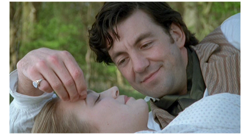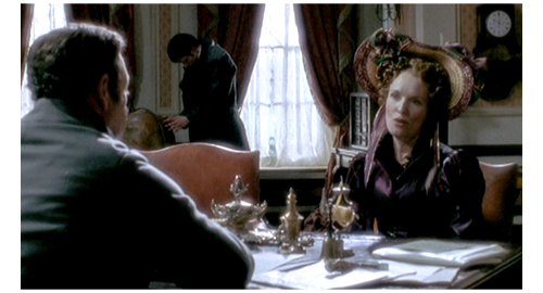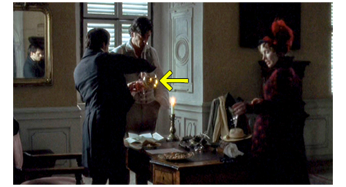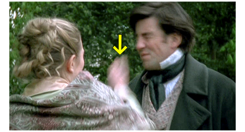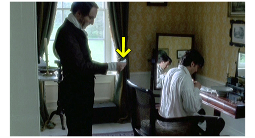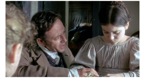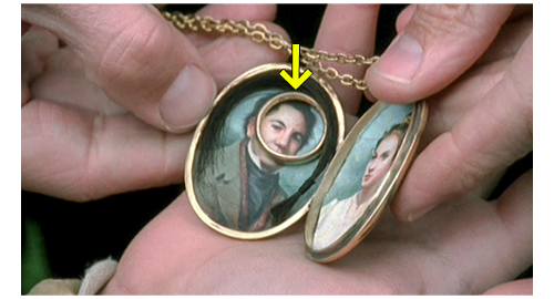 季節は冬になり、大きな窓越しにアグネスとローズの姿が見える(1枚目の写真)。この写真〔家が映っているのは、このシーンだけ〕を敢えて示したのは、フレミングが如何に立派な家に住んでいるか、そして、あとで逃げるように移り住んだ家と対比できるようにするため。さて、家の中での会話は、アグネスの妊娠による体調不良に対するもの。妹のアグネスは、第49章の❻の「まだほんの二、三歳だった」と違って、ここでは十歳くらい。「病気なの、お姉様? お母様みたいに?」と心配する(2枚目の写真)。アグネスは、「ローズ、病気じゃないの」と否定するが、口が裂けても妊娠とは言えない。「でも、どこか変よ。でしょ?」。その時、ダブリンから手紙が届き、会話は中断される。そして、画面もダブリンに飛び、エドウィンは貴金属店でロケット・ペンダントを選んでいる。そして、イギリスからわざわざ持って来たアグネスの肖像画を渡し(3枚目の写真、矢印)、「反対側は、どうされます?」との質問に、「そうだな、一対にしたいんだ」と答える〔ロケットの中に描く肖像画だが、アグネスの方は額があるからいいが、エドウィンの方はどうするのだろう? もちろん写真など存在しないから、絵師が描く間 店でじっと待っていなければならない〕。そして、金の指輪の方には、彫って欲しい文字の紙を渡す。指輪の裏には、片側に「アグネス・リーフォード」と フレミングではなくリーフォード姓にしてあるが、もう片側にエドウィンの名はまだない。これについては、原作の 【第38章モンクスはそれをひったくると、震える手でそれを開いた。中からは髪の毛二束が入った小さな金のロケットと、かまぼこ形の金の結婚指輪が出て来た。「内側に『アグネス』と刻ってある」。婦長が言った。「苗字のところは空けてある。その次に日づけが刻ってあるが、それは子供が生まれた日から遡って一年以内だった」   という一文がある。指輪に彫られた文字が違う。