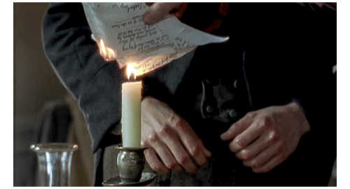 エドウィンが飲んで十秒もしないうちに、彼は咳き始め、次いで、体を折り、最後は、床に崩れるように倒れる(1枚目の写真、矢印)。エドワードは、心配になり、「あれ、僕が渡したんだよ」と母に言う。「死にかけてるの、バカね」。「死にかけてる?」。「当たり前よ。一小隊 殺せるだけの青酸入りだから」。「なぜ、言ってくれなかったの?!」。「わめくんじゃない! 役に立つことをなさい。彼のポケットの中身を、全部出して」。「できないよ、母さん」。鬼女は、テーブルの上の遺言書を切り裂き、ロウソクの火で焼く(2枚目の写真)。この時、エドウィンが急に起き上がり、鬼女の肩につかまる。鬼女はテーブルの上に置いてあったナイフでエドウィンの横腹を刺す(3枚目の写真、矢印はナイフ)。エドウィンは、倒れながら、「弁護士が… 写しを…」と言って、息絶える。鬼女は、エドワードを連れて馬車でイギリスに向かう。「もし、弁護士が遺言書を持ってたら、あたし達の負け。彼女の勝ち。彼女に会うのよエドワード、誰よりも先に〔アグネスを殺すため〕。幸い、殺人事件らしく見える。毒殺だと女性が疑われるから。きっと、単なる強盗と考える… 強盗殺人だと」。原作では、【第51章 ❷モンクス:「こいつの父親がローマで病気になったので、長いこと別居をしていたその妻、つまり僕の母が、僕を連れてパリから駆けつけた… 父は僕たちが来たことにも気がつきませんでした。意識がなくなっていて、翌日まで昏睡状態で、そのまま死んでしまったのですから。机の上に残されていた書類の中に二通の手紙がありました。最初に病気で倒れた日付で、宛先はあなたです。あなた宛ての簡単な手紙が同封されていて、封筒の表には死ぬまでは投函してはならぬと書いてあった。手紙の一通はこのアグネスという娘に宛てたもの。もう一通は遺言書でした」。第51章 ❹ブラウンロウ:「遺言書は先の手紙と同じような趣旨のものだった。妻からこうむった様々な不幸について、たった一人の息子(モンクス)が反抗的で、性悪で、意地悪で、早熟ですぐかっとなる性分で、父親を憎むように育て上げられたこと、などが書いてあって、君と君の母親にはめいめい八百ポンドずつの年金を遺した。残りの財産を二等分して、半分はアグネス・フレミングに、半分は生まれて来る子供が生きていたら、成人に達した時に与えることになっていた。もし女の子だったら無条件で遺産を相続すること。もし男の子の場合には次の条件がついていた。すなわち成年に達するまでに不名誉、卑劣、臆病、非行といった行為が表沙汰にになって、その名前を汚すようなことがない場合に限るというのだ。こんな条件を付けたのは、生まれて来る子の母親への信頼、その子が母親から優しい心と気高い性質を受け継ぐに違いないという確信をあらわすしるしとしてやったのだ、と書いてあった。原作ではエドウィンは病死。映画では妻による毒殺。原作をかなり変えたことになる。