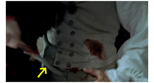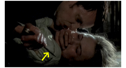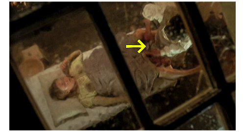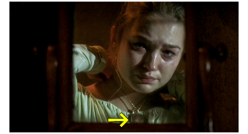 一方のアグネス。エドウィンが遺していった指輪の入ったロケットに 泣きながらキスすると、それを首にかける(1枚目の写真、矢印はロケット)。そして、逃走用の荷物をバッグに詰めると、隣のローズの部屋に行き、眠っている妹に向かって、「みんな、私が悪いの。こんな私にも、居られる場所がどこかにあるわ」と涙ながらに声をかける。次いで、一階の父の寝室に下りて行くと、家出にあたっての詫び状をしたためる。「お父様へ。ごめんなさい。ほんとに、ごめんなさい。ずっと愛してます。アグネス」と書かれている(2枚目の写真、黄色の線は「お父様」)。そして、アグネスが階段を上がって寝室までバッグを取りに行くと、隠れていたエドワードが背後からアグネスに襲い掛かり、左手でアグネスの口を押えて声が出ないようにし、ベッドに押し倒す。アグネスは手を噛んで、ベッドから床に滑り落ちるが、今度は床に仰向けに倒れた状態で、左手で口を押えられる。そして、エドワードが右手に持ったナイフが高く掲げられる。しかし、その時、エドワードを発作が襲い、床に倒れ込んだエドワードの右手は痙攣を起こし、ナイフは小刻みに床を何度も突く。そして、「できない! できない。俺には無理だ」と言うと、今度はアグネスに向かって、呪いの言葉を吐きかける。「聴いておけ。覚えとけ。胸が張り裂けるだろう。夜毎、お前は うなされるだろう。一生涯。俺が来たのは偶然じゃない。送り込まれたんだ。お前を殺すために! 頼まれたのは、お前だけじゃない」(3枚目の写真、矢印はナイフ)「息を引き取る間際、エドウィンは叫んだ。『子供も殺せ!』〔そんなことは言ってない〕。だから、俺が願いを叶えてやる!」。それだけ言うと、ナイフを床に刺し、次いで、二人の間で揉み合いが始まる。結局、エドワードはアグネスを傷つけることはできず、アグネスは悲鳴を上げながら、部屋から飛び出て行く。