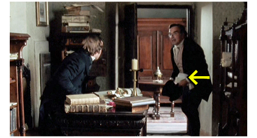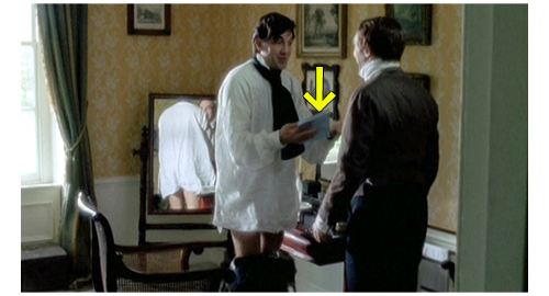 残されたエドウィンは、マシューズと話す。「この問題について、何か言うことはあるか?」。「ありません」。「こう 言いたいんじゃないか? フレミングに会うべきだと。わが友にして、私を信頼し、何人も殺したことのある 彼と… どう話す… 『娘さんを妊娠させました。でも、結婚はできません。私の名前を名乗ることもできません』」(1枚目の写真)「それしか言えない。だろ?」。「はい、そうです」。「告白を?」。「はい、そう なさるべきです」。「なぜ?」。「あなたは、紳士だからです」。「そうだな。それに、私は この愛を失いたくない」。そして、気が重いフレミング邸に行く前に、至急便をチェックすることに。エドウィンは、まず、どうせロクでもないパリからの便から、マシューズに読み上げさせる。「愛しいエドウィン。また、こんなことを お願いして心苦しいのですが、こんな僅かな送金では お金が足りません。年二百ポンド下さい。とても、生きていけません。お願いです。エドワードも、よろしくと」(2枚目の写真、矢印)。次は、ローマからの便。一読したマシューズが、読み上げずに手紙をエドウィンに渡す。読んだエドウィンは、「凄いな、マシューズ! 素晴らしい!」と、歓喜のあまり立ち上がったので、ベルトの締めてないズボンがずり落ちてしまう(3枚目の写真、矢印)。第49章の❾(後述)に「自分の利益と権勢を強固にするために、お前のお父さんを犠牲に供した例の金持ちの親戚の一人がとうとう死んでしまい、自分がもたらした不幸のつぐないにと… 金をお父さんに遺した」と書かれている。だから、仰天して喜んだ。