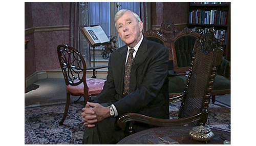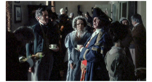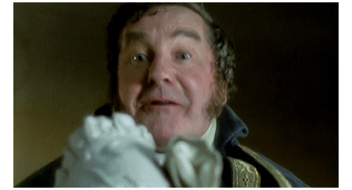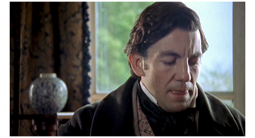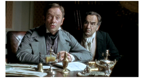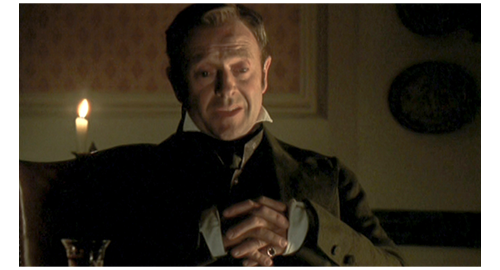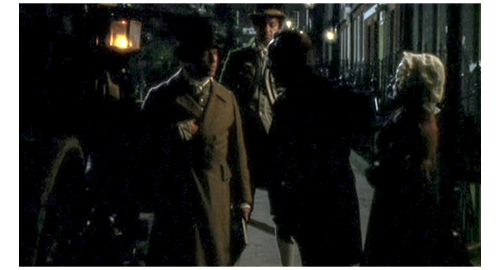 バンブルが門から出て行った直後、画面は、雪の積もった冬に変わり、バンブルがまた門に現れる(1枚目の写真、矢印)。コーニイ夫人が、また二階の窓から顔を出し、「今日の ご用は何ですの、バンブルさん?」と尋ねる。「オリバー・ツイストが、じき九歳になるので、救貧院に引き取りに来たんです。法ですからな」。コーニイ夫人は、二階で他の子供と遊んでいたオリバーに声を掛ける。「オリバー、聴いたかい? お別れだね。何て悲しいんでしょ」(2枚目の写真)〔大きくなったオリバーが登場する唯一の数秒のシーン〕。そして、すぐに、ラッセル・ベイカーが再登場する。「今夜の筋立ては、リーフォード夫人による夫殺しなど、原作と大幅に異なっています。リーフォードは、筋書き上、死ぬことになっていますが、原作では病気というだけで、曖昧に片付けられていました。ビクトリア時代の作家は、登場人物を死なせる必要がある時に “曖昧な病気” が好きでした」(3枚目の写真)「殺人は、現代ほど “軽い話題” ではありませんでした。それは、言語に絶する恐怖であり、ディケンズも稀にしか使いませんでした。癇癪もちの妻が夫を刺し殺す。それも、殺す相手の目を見据えながら。そんな光景は、ディケンズにとって考えられないほど忌まわしいことでした。ラッセル・ベイカーでした」。これで第一部が終了する。
