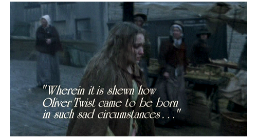 DVDの冒頭に、アメリカの作家ラッセル・ベイカーが登場し、こう述べる。「今夜の名作劇場〔Exxonmobil Masterpiece Theatre〕は、三十周年記念として 著名な文豪に敬意を払うことにしました。チャールズ・ディケンズです。原作は、暗く メロドラマ風の『オリバー・ツイスト』で、百五十年にわたり、多くの読者を惹きつけ、映画や舞台になり、ブロードウェイやロンドンでミュージカルも上演されました。さて、この有名な おとぎ話の世界では、子供達が邪悪な力に もて遊ばれます。幼いオリバーは、子供達が餓死したり過労死するような世界に投げ込まれます。そこは、盗賊、偽善者、児童虐待者、娼婦の世界で、精神を病んだ殺し屋、恐怖のビル・サイクスもいます。中でも、悪の権化は、背徳的ながら興味深いフェイギンで、あらゆる文学作品の中でも 最も奇怪な悪党の一人です。大半の読者は、きっと覚えていないでしょう。オリバーがどこから来たかとか、彼の母親が誰で、父親が どう死んだかなど、ディケンズは、この点について ほとんど触れていません。それも、本の最後の何ページ(book's last pages)かにです〔曖昧な表現。大半の記載は第49章と第51章、一部が第40章、あとは断片的に第38,46,52,53(最終)章に触れられている〕。それが、筋書きを複雑にしているのです〔「複雑」ではなく、意味不明〕。それを避けるため、今夜は、オリバーの誕生前から話を始めます」(1枚目の写真)「彼の両親が どんな人物で、なぜ、財産を相続するに至ったか。そして、なぜ、オリバーが何度も危険な目に遭うのか? この作品は、ハリウッド流に言えば『オリバー・ビギンズ』に あたります。では、『オリバー・ツイスト』三部作の、第一部の開幕です」。そして、第一部の最後の方の場面(オリバーの母がオリバーを生む町をくたびれ果てて歩くシーンを背景に、「第一部では、オリバーが どうして悲惨な状況下で 誕生したかが、語られる…」との文字が表示される(2枚目の写真)。そして、遂に歩けなくなった母は、産気付いていることから、医者のいる救貧院に運んでいかれる。そして、専属の医者は、無事赤子を取り出し、男の子だと母親に告げる(3枚目の写真)。母は 「一度だけ抱かせて。そしたら、死ねる…」と言い、医者が赤ちゃんを連れて行くと、赤ちゃんに触れて涙を流すと、力尽きて死んでしまう。そして、母親の顔が、生前の笑顔に変わり(4枚目の写真)、ここから第一部が始まる。