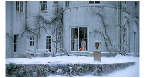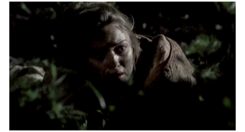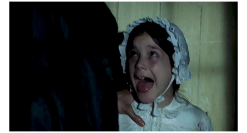 その悲鳴は、ローズを起こしただけでなく、家を見下ろす丘の上で待っていた鬼女の耳にも届く〔フレミングは眠ったまま〕。鬼女は、ローズがバッグを持たずに身一つで家から逃げ出していくのを見る(1枚目の写真)。目を覚ましたローズが姉の部屋に行くと、ナイフを持ったエドワードが立ち塞がる。「誰なの? “子取り鬼(ブーギーマン)” なの?」。「ああ、俺は “子取り鬼” だ。悪魔だ!」。エドワードがそう叫んでナイフを振り上げると、ローズは悲鳴を上げ(2枚目の写真)、それを聞いて目が覚めたフレミングが、「アグネス?!」と言って上がって来たので、エドワードは窓から逃げ出す。ローズは父に抱き着くが、その父は、ようやくアグネスがいないことに気付く。一方のエドワードは、「母さん! 僕のせいじゃない! 無理だ! 人が殺せるほど 僕は健康じゃない!」と言いながら、丘の上の母の所まで走って行く。「転倒した。発作だ! 発作だよ、母さん!」。鬼女は、同情するどころか、「ナイフを捨てて! お前のせいで絞首刑は真っ平!」と言い、馬を駆って逃げて行く。