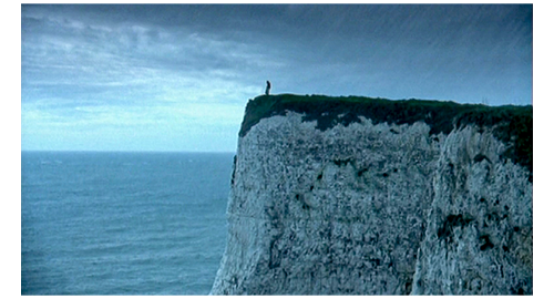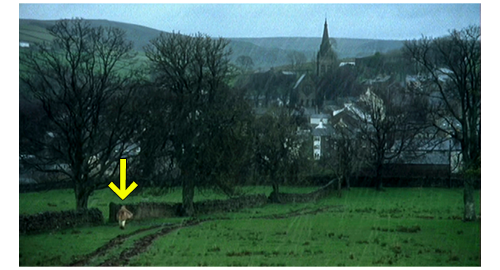 アグネスは、どしゃぶりの雨の中、ドーバー海峡に面した白亜の崖の先端まで行き(1枚目の写真)、ロケットを指輪ごと海に投げ捨てようとするが、どうしても捨てられずにその場に座り込んで泣き出す。しばらくすると、大きなお腹を抱えてゆっくりと丘を下り、近くにあった町に向かって歩いて行く(2枚目の写真、矢印)。〔このロケ地は、ロンドンの北北西約400キロにある内陸の町Alston(オールストン)。グーグルのストリートビューの映像を3枚目に示す(ドーバー海峡とは全くの無関係)〕。映画の中では、2分少し後のシーンで順序は逆転するが、鬼女とエドワードを乗せた馬車も この町までやって来る(4枚目の写真)。エドワードは、「あの状態じゃ、ここまでは歩けなかったさ」と言うが、鬼女は 「念には念を入れないと。あの女の望みなど、考えたくもないけど」と答える。「何を望んでるの?」。「お前の父さんのために、赤ん坊を生もうと必死なのさ」。