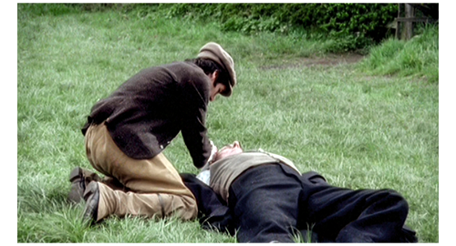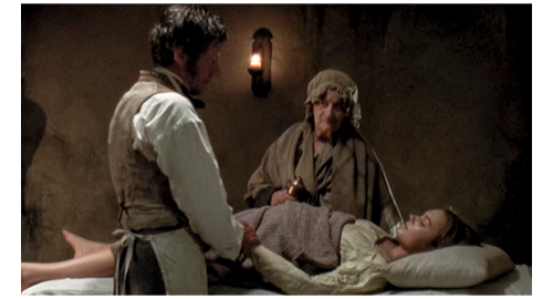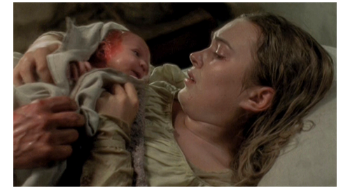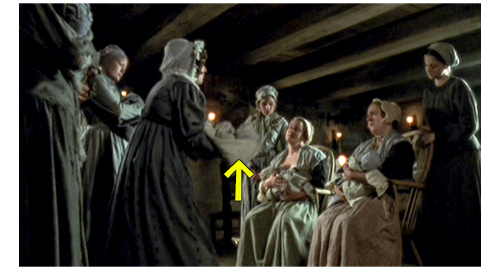 アグネスのお産のシーンは、雨が叩きつけるガラス窓からの映像。赤ちゃんが生まれ、医者が、へその緒をハサミで切る(1枚目の写真)。医者は赤ちゃんを抱き、「息をして」と声をかける。しばらくすると、泣き声が聞こえる。「あの世と この世で 迷ってたのかい」。アグネスは、「一度だけ抱かせて。そしたら、死ねる…」と頼む。医者はアグネスの前に赤ちゃんを持って来る。アグネスは、赤ちゃんの顔をじっと見ると(2枚目の写真)、額にキスする。医者は、アグネスの様子が急変し、意識を失ったので、急いで赤ちゃんを取り上げてテーブルの上に置くと、アグネスに蘇生措置を施すが、アグネスはそのまま死んでしまう。医者は、アグネスの手を見て、「よくある話だ。ほら… 結婚指輪がない」(3枚目の写真)「こんなに きれいな娘さんなのに」と言い、アグネスの顔に布を被せる。そして、横にいたサリーに、「赤ん坊が起きたら、粥をやってくれ」と言って出て行く。