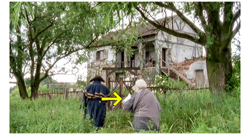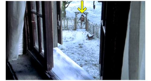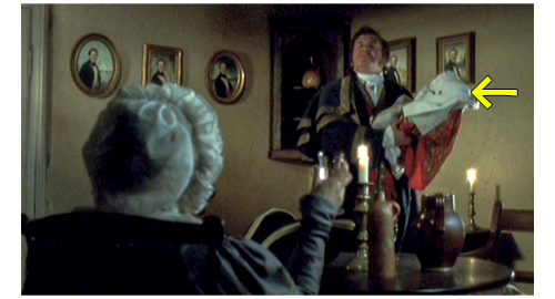 ここで、また順序が入れ替わる。場所は、救貧院。婦長のマン夫人が、夫の肖像画を見ている。額の背後には、恐らく訃報が(1枚目の写真、矢印)。夫人は、手紙をくしゃくしゃにしてしまう〔字は読めない〕。原作の 【第23章 ❶「こう言うと婦長は椅子にぐったり崩れ込み、またテーブルの上に肘をついて、自分の孤独な運命のことを考えた、小さな急須と一つしかない茶碗が、コーニイ氏(二十五年以上も前に死んでしまったのである)のことを思い出させ、彼女は悲しみに心が沈んでしまった は、オリバーが9歳になってからの話。この場合は、婦長のコーニイ夫人は、もう25年も寡婦だったことになる。しかし、これが訃報だとすれば、コーニイ氏はオリバーが生まれてしばらくして、海外の赴任地で死亡したことになる。だから、それまでは、夫のある妻。今後は、寡婦になる。そこに、バンブルがドアをどんどん叩き、「やりましたぞ、マン夫人、遂に!」と、誇らしげに報告する。「手に入れました。やったんです。認可状を。眠りを妨げる オリバー・ツイストは、もうここにはいません」。婦長は 「自慢そうに言われても、あれから二十日も経ったのですよ」と、あまり評価しない。ここで、ブラウンロウ邸の前半が入る。そして、バンブルは雑草の生い茂った野原を歩いて、一軒の貧相な家に近づいて行く。後ろからは、オリバーを抱いたサリーが付いてくる(2枚目の写真、矢印はオリバー)。「歩きに歩いて、着いたか」。バンブルは、杖で木の門を叩き、「コーニイさん、教区吏です」と大声で呼ぶ。コーニイは二階の窓から顔を出し、「バンブルさん! よく いらっしゃいました!」と言うが、室内がごちゃごちゃなので、至急片付けさせる。ここで、ブラウンロウ邸の後半が入る。室内に入ったバンブルに、コーニイは、「遠くまで歩いて来られたのですから、何か一杯いかがですか、バンブルさん?」と尋ねる。「いかん、一滴もいかん」。「ほんの一口。可愛い子供が病気になった時のための気付け薬なんです、バンブルさん。ジンですわ」。ここで、次の節の場面が入る。バンブルは、ジンを飲むと、「これで失礼する、コーニイ夫人」と言い、サリーには、「その子を、そこらの床に置いとけ」と言って、出て行く。サリーは、オリバーを、文字通り床の上に置き、後を追う(3枚目の写真、矢印はオリバー)。