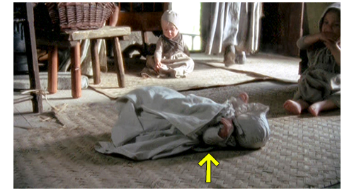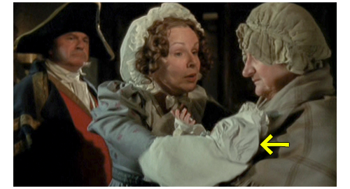 次のシーンは、オリバー。婦長は、粥を食べさせようとするが、当然食べてくれない〔離乳食は生後5~6ヶ月頃から〕。そこで、「誰か、母乳の残ってる人を捜さないと」ということになる。ところが、救貧院の中とはいえ、母乳を与える係の二人の女性は、婦長に対し、「列に割り込むのは不公平ですわ。みんな飢えてるのに」。「自分の子の分だって足りないんです」と、口々に文句を言う。「親切心ってものがないのかい?」(1枚目の写真、矢印はオリバー)「恥を知りなさい。この可哀想な孤児が、母親を亡くしたばかりだというのに。亡くしたのよ。永遠にね。あんた達の子供と、そこが違うの」。これに対しても、生意気な二人は、「その人も、私達を困らせたくはないでしょう。なぜ、亡くなったんですか?」と、1820年代の救貧院に収容されている女性としては異例の反抗的な口調で話す〔原作では、あり得ない発言〕。「そんなこと知るもんか。それに、私がお願いしてるんじゃない。私がそんなことするもんか。この子がお願いしてるんだよ!」。「バンブンさんがドアの隙間から覗くのを止めさせて下さい」。それを聞いたバンブルは、「濡れ衣だ!」と弁解する。「私達の乳房を見てるんですよ! こそこそと」〔救貧院の入居者が、教区吏に対してこのような誹謗中傷的なことを言える時代ではない。この部分の脚本は、時代性を完全に無視していて良くない〕。婦長は、結局、サリーにオリバーの処置を任せる(2枚目の写真、矢印はオリバー)。原作では、このように書かれている(第2章の冒頭: この親なしの赤ん坊の空腹状態は、救貧院の関係筋から教区の関係筋へと然るべく報告された。教区の関係筋は威儀を正して、オリバー・ツイストに彼が必要とする慰安と栄養とを与えるべき状態にある女性が院内に居住しておらねか、と救貧院の関係筋にご下問を賜わった。救貧院の関係筋は遺憾ながらおりませぬ、とうやうやしく返答した。そこで、区の関係筋は有り難きご慈悲によって、その子を「人手に預ける」べきことに決定した)。