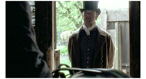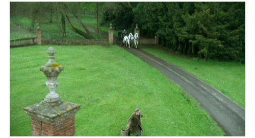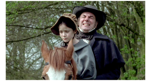 一方、あの夜、アグネスを探して、ローズと一緒に馬に乗って出かけたフレミングは、どこをどう彷徨ったのか、この次のシーンで、田舎家に戻って来る。そして、まさに家の前に来た時、突然 発作に襲われ(1枚目の写真)、意識を失って落馬する。駆け付けた使用人が様子を見ると(2枚目の写真)、フレミングは死んでいた。原作では、こう書かれている。【第51章 ❽モンクス:「その後間もなく父親は、その家で夜のうちに死んでしまいました。その数週間前に娘がこっそり家出をしてしまったのです。そこで父親はてくてく歩いて近在の町という町、村という村を探して廻ったあげく、娘は自分の恥と父親の恥を隠すために自殺したに違いないと思って、家に帰り着いたその夜に、老いの胸が悲嘆にはり裂けたのです。状況はかなり違っているが、フレミングが死ぬことに変わりはない。かくして、ローズは 孤児となった。