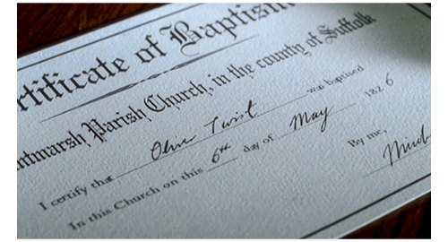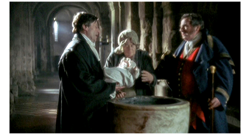 次は、救貧院。サリーに抱かれたオリバーは お腹が空いて泣きっ放し。婦長はバンブルに、「ここでは 何もしてやれないから、残念だけど他に途はない。洗礼を施したら、委員会に申請して、育児施設を探さないと。でも、私には全然時間がなくて… あなたにやって頂ければ、バンブルさん、安心できますわ」と お願いする。バンブルは、「喜んでと申し上げたいところだが、赤ん坊の件で委員会へねぇ。おまけに、洗礼まで… でも、まあ、やりましょう、マン夫人」と、渋々ながら 恩を売ろうとOKする。バンブルは、サリーにオリバーを抱かせて、教会に連れて行く。牧師は、「簡易洗礼でいいんだね、バンブル? 外へ預けるためだな?」と念を押す。そして、洗礼盤の前まで行くと、「父と子と聖霊の名において」(1枚目の写真)「洗礼を授ける、汝 オリバー… ミドル・ネームは?」。「ありません」。「ツイスト」。そして、洗礼証明書が渡される(2枚目の写真)。「聖マーシュ教会、サフォーク郡/1826年5月6日」〔遺言書は4月16日付けだったので、それからちょうど20日経っている〕。洗礼が終わったので、バンブルは、救貧院の委員会に出頭する。オリバーが大きくなってから、さんざん虐められる、あの大食い揃いの驕り高ぶった委員会だ。傲慢な委員長は、「わしは、同時に 食べたり聴いたりできん。書記にやらせればいい」と(3枚目の写真)、部屋の片隅に置かれた机の前にいる書記に任せる。書記は、わざとか、それが習慣ななのか、大きな冊子を一枚一枚ゆっくりとめくる。バンブルは、「おい 早く。遅いぞ。こっちを見るな。書類を見ろ。文字だ。あれを聴いたか? もう 何時間も泣いとる。何時間もな」と、書記を急かす。そして、ようやく辿り着いたページに、「ビートン養育院。事業者、コーニイ夫人」と書いてあった(4枚目の写真)。その先も、原作にはない障害が続く。「満員です」。「そんなの あり得ん。満員になるまで長生きするはずがない。とにかく短命なんだ」。「可哀想に。次々と死んでいくらしいですね」。「じゃあ、早く認可状を」。「私には作れません。ドッズさんの担当ですが、今、赤痢で倒れておられます。ですから、あと数日は待って頂かないと」〔何というお役所仕事〕