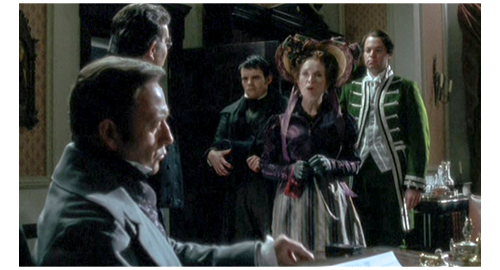 【第49章  ❿ブラウンロウ:「お父さん〔エドウィン〕が外国に出かける前、途中ロンドンを通りすがりに… わしに会いに来たのだ。そして、わしの手に幾つかの物を残していったが、その中に一枚の絵――自分で描いた、この可哀想な娘〔アグネス〕の肖像画――があった。家に置きたくはないし、急ぎの旅行に持って行くわけにもいかなかったわけなのだ。お父さんは心配と後悔のために幽霊のように痩せ細り、気が狂ったようなとりとめのない口調で、自分の犯した破滅と不面目のことを物語り、どんな犠牲を払っても全財産を金に変えて、今度手に入った財産の一部を妻〔エリザベス〕と子〔モンクス〕に譲り渡した後、この国から逃げ出して再び戻って来ないつもりだ、とわしに打ち明けたが、一人だけで逃げ出すつもりでないことは、わしには充分見当がついた。しかし、それ以上の詳しいことは打ち明けてはくれなかった。あとから一切の事情を手紙で知らせる… と約束してくれたのだが… 手紙も貰わなかったし、二度と再び会うこともなかった。これは、エドウィンがローマに行く前、ロンドンにいるブラウンロウに会いに行ったことを記した唯一の箇所。映画では、高級集合住宅(タウンハウス)に住むブラウンロウに邸に、突然、エドウィンが夜到着する。男女の召使が出迎えた後、家政婦のベドウィンが現われてハグし、そこにブラウンロウが階段を下りてきて握手する(1枚目の写真)。右に、当時のタウンハウスの一般的な内部構造を示す。予告なしの訪問に、ブラウンロウは、「何事だね? 劇的かな?」と訊く。「ギリシャやシェークスピアの劇のようなものじゃありませんが」。エドウィンは、居間に連れて行かれる。ブラウンロウは、「分かってたよ、こんな日が来るかもと。不肖の知人を、家に迎え入れるような…」と、言った上で、「で、君達は?」と訊く。エドウィンは、「後悔は していません」と言うと、アグネスの肖像画(2枚目の写真、矢印)を、机の上に置く。上記の 第49章の❿の「可哀想な娘の肖像画」 だが、彼が自分で描いたとは思えない。そして、「彼女を置いてきました。無慈悲にも。あらゆる 恥辱と不名誉が降りかかるのを承知で。僕を、友人のように遇してくれた一家なのに」と反省する。留まることも できたはずだな?」。「もちろん、そうですとも。でも、ローマに行って、戻って来るだけです。戻ったら、神の許しを得て、金に糸目をつけず祖国を去るつもりです」。ここまでは、第49章の❿の「自分の犯した破滅と不面目のことを物語り、どんな犠牲を払っても全財産を金に変えて」「この国から逃げ出して再び戻って来ないつもり」 に該当するが、原作では 次のような明確な発言はない。「その時は、もちろん彼女と行を共にし、二度と別れません」。こうした弁明に対し、ブラウンロウは、「だが、君は、既婚者なんだ」と、最大の難点を指摘する(3枚目の写真)。「アグネスも、同じことを…」。