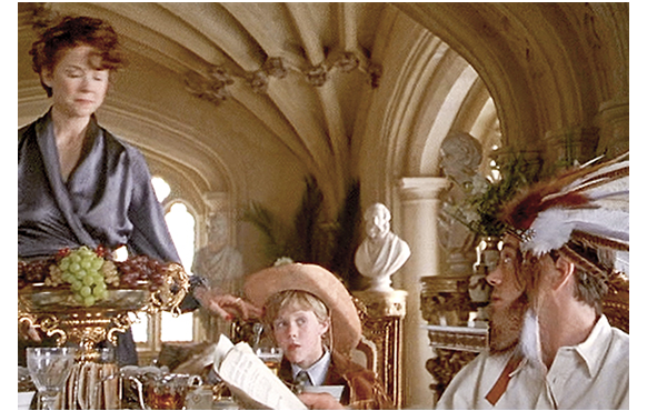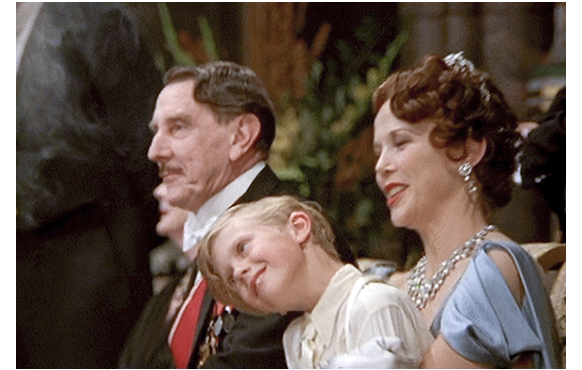 舞踏会のシーンから3枚。1枚目は、王子が王妃に抱かれている姿。皆が踊っているので、体を振って楽しんでいる。左隣は国王。2枚目は、王妃と踊る王子。王妃は、弟のリヴァーズ伯アンソニーが姿を見せたので、大喜びで迎えにいく。寄っていった王子は、リヴァーズ伯に抱き上げられる(3枚目の写真)。伯爵を演じているのは、アイアンマンことロバート・ダウニー・Jr。