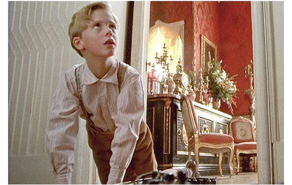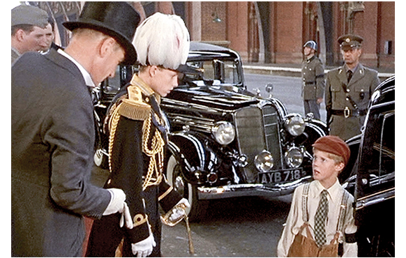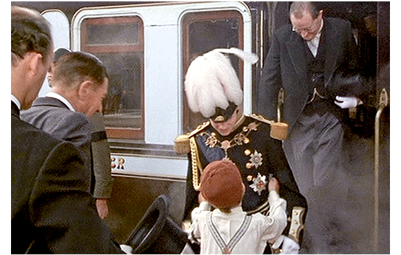 王太子を乗せた列車が駅に到着する。摂政であるグロスター公の指示で、出迎えは最少限の関係者のみ。王子は、手を振って(1枚目の写真)、兄を迎えに走って行く。列車から降りた王太子は、この場面が初登場(2枚目の写真)。歴史的事実は、12歳と9歳だが、映画の王太子はどうみても青年だ。出迎えが少ないのに驚いた王太子に対し、グロスター公が嘘の言い訳を述べていると、王子が寄って来て、「リチャード叔父様」と 手を引っ張り、列車の中に連れていく〔王子に対して、優しい叔父の顔を見せるところが怖い〕。次に現れた時、王子はグロスター公のシルクハットをかぶっている。そして、「猿のように小さいから、肩にかつげるでしょ」と言って(3枚目の写真)、不具の左肩に乗ろうとしたので、激痛のあまりグロスター公は倒れ、王子も投げ出される〔この時も、王子に対しては怒らない〕。