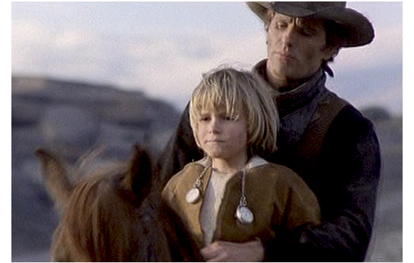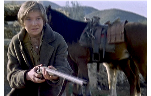 貧しい父子が、食事処を訪れると、金持ちの男が出てくるのに出会った。男に対し、騙して不毛の土地を売ったとなじる父。「貴様らのせいで 一文無しだ」。「ご愁傷だな」。「土地も金もない。どうやって、生きてくんだ?」。「かかあを 売春宿にやって、しっかり 働かせりゃいい。簡単に 儲かるぜ」。かっときた父が銃に手を伸ばしかけた時、いち早く撃たれてしまう。相手が背を向けた隙に、父の銃で仇を撃ち殺す12~14才の少年。多分、人を殺したのは始めてであろう。少年は、男の使っていた銀の鞍に乗って去っていった。