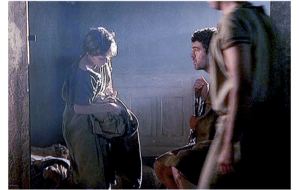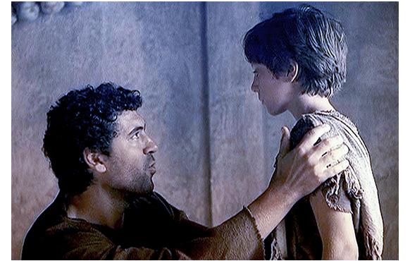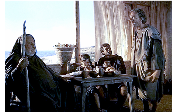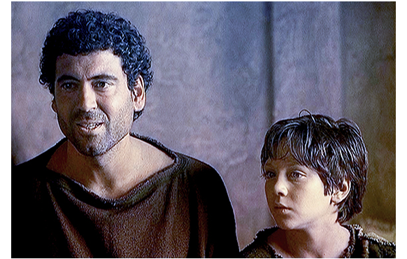 ヨハネの書簡はパトモス島から出されていた。それを手渡した老人の名はテオピラス。ヨハネはまだ生きていて、本当にこの書簡を書いたのか? それとも、テオピラスがヨハネの名を借りて書簡を書いたのか? ガイアスの命を受けてアイリーンは、テオピラスに会いに行く。その際は、テオピラスと名乗る老人から書簡を手渡されたが、彼が誰なのかは不明で、ヨハネとも会えなかった。確たる証拠のないまま新たな書簡を持ち帰ったアイリーン。信心深いシルヴァーノは、ヨハナンに「息子よ。巻物には、我々すべてにとって非常に重要なことが書かれている、と私は信じている」と語る(1枚目の写真)。この言葉に希望を感じたヨハナンが、一瞬だが明るい表情を見せる(2枚目の写真)。『トムとトーマス』を思わせる表情だ。この直後、エラクルは「幻想だ! 家に隠れている仲間に、そう言うがいい。ローマの監獄にいる仲間に、そう言うがいい。もし、ヨハネがここに来ないのなら、もし生きているという証拠を見せないのなら、信仰を続ける勇気を 彼らは見出せるのか?」。ガイアスが、「書簡が神のご意志だと証明されるまで待つべきだ」と諌めるが、エラクルは「ローマ兵は待ってくれん」とあくまで否定的。