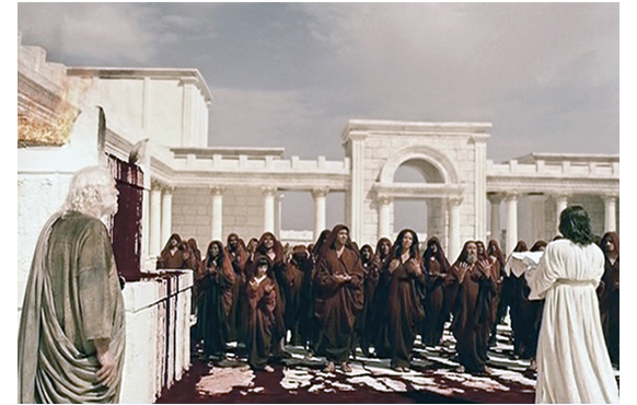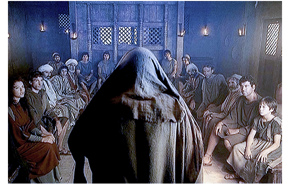 このシーンの直後、画面はパトモス島のヨハネへと移行する。そして、ヨハネはヴィションの中で、天国の神の館の聖火台から大量の血が流れ出しているのを見る。これは、皇帝の命令によりキリスト教徒の大量の血が流されたことを表象している。聖火台の横には、虐殺で殺された人々が、天国に召され、血の色の衣をまとっている。中に、シルヴァーノとヨハナンもいる(1枚目の写真)。それを見たヨハネは、「主よ、いつになれば、無垢なる血が流されずに済むのですか?」と問う。神は、「もう少し我慢せよ。そなたの仲間の者たちの数が満つるまで。さすれば、死を乗り越えて わが勝利を共に分かち合おう」(2枚目の写真)。なお、映画の最後で、皇帝が暗殺され、ヨハネはエフェソスに戻ることを許され、そこで死を迎えるが、その場にシルヴァーノとヨハナンはもちろんいない。その代わりに逃げたエラクルがのうのうと顔を出している。これは観ていて許せない(私は信者ではないので、あくまで一視聴者としての感想)。