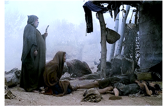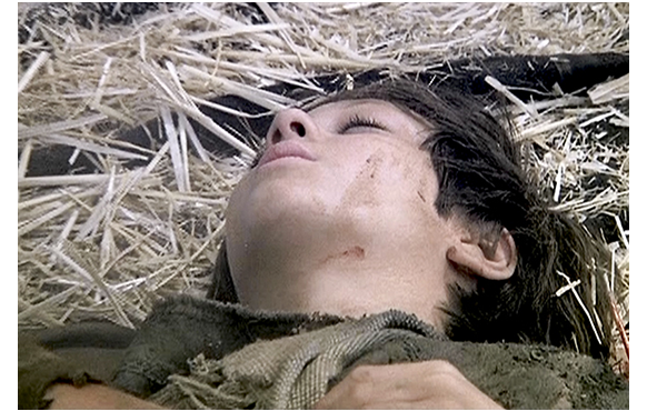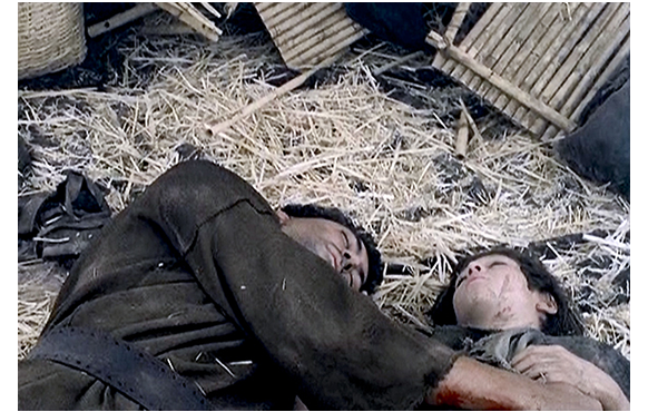 アイリーンがパトモス島で、テオピラスこそヨハネだと知って感激している頃、エフェソスの総督府では、皇帝から届けられた命令に総督が苦慮していた。しかし、軍人にとって命令は絶対なので、仕方なく部下を呼び集めて命令する、「この地区のキリスト教徒の村を襲い、すべての住民を殺せ。皇帝直々のご命令だ。直ちに実行せよ」。ローマ軍はシルヴァーノとヨハナンの住む村にも襲いかかる。住民全員が惨殺される。そこに、ガイアスと、パトモス島から戻ってきたアイリーンが到着する。死んでいる人々の中からシルヴァーノとヨハナンの姿を見つけると(1枚目の写真)、アイリーンは2人の亡骸の前に跪き(2枚目の写真)、「主よ、これがあなたのご意志なのですか?」と泣き伏す。ヨハナンの顔がクローズアップされる(3枚目の写真)。