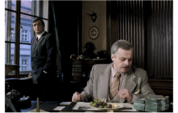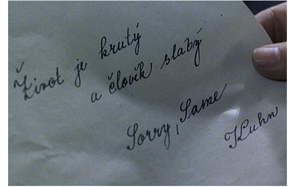 サムは、マネージャー(ユダヤ人)に、パリ行きのビザや切符の手配をさせていたが、費用が10万コルナ(約1000万円)かかると聞いたので、接収前にバイオリンを売り、そのお金を渡して手続きを進めるよう依頼した(1枚目の写真)。ところが、翌日、切符を取りにオフィスに行くと、秘書が「発たれました」「パリです」「奥さんと」と言う。部屋に入って机を調べると、中には一通の走り書きが入っていた。「人生は無慈悲で、人間は弱い。お許しを」(2枚目の写真)。