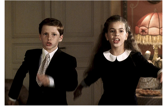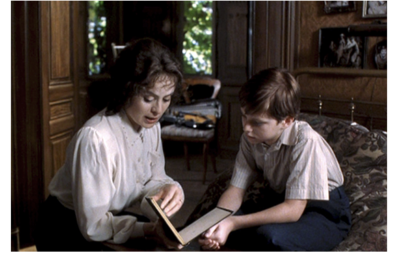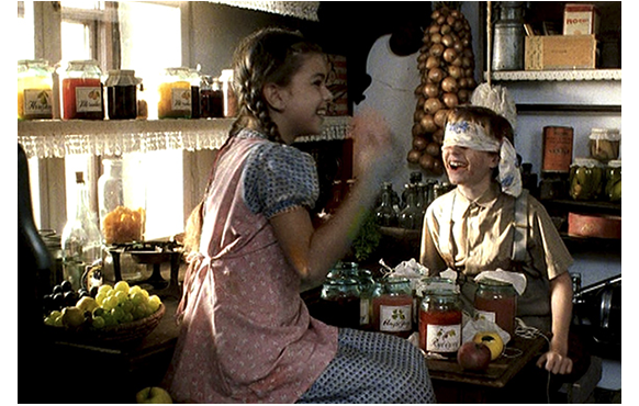 ダビデの母イルマは、昔オペラ歌手になりたかったが歌を禁じられた経験があり、ダビデにはピアノやヴァイオリンを(無理矢理)練習させていた。そして内輪の演奏会で自分も歌おうと猛練習をしている。ダビデも、しぶしぶヴァイオリンを弾いていると、ソーシャが来たので大喜び(1枚目の写真)。ヴァイオリンなんかやめて、ソーシャと一緒に食品の貯蔵室へ。そこで、ソーシャはダビデに目隠しし、置いてあった大切なジャムの封を次々と破り、指でダビデの口にジャムを入れては果物を当てさせる。「これ、なーんだ?」。「アプリコット」。「赤スグリよ。また、間違えた」「じゃあ、これは?」。「ピーチ」。「グースベリー。全部違ってる」「最後よ」。「サクランボ!」。「やっと、当たった」。「ちゃんと、当たったろ!」。そこに、ダビデの母が。ヴァイオリンの音が止んだので、不審に思って見に来たのだ。そして、大切な手作りのジャムをめちゃめちゃにされ、激怒する。