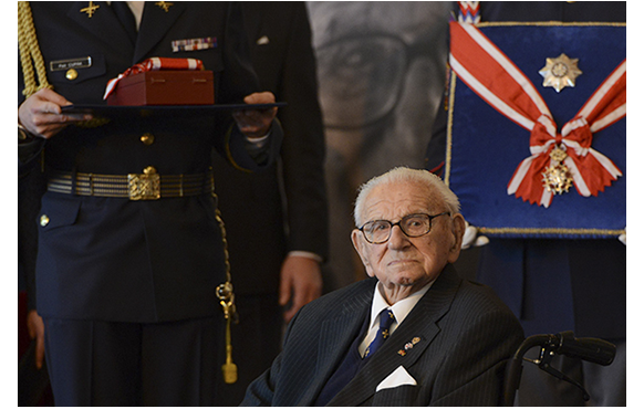 結局、次の列車は出なかった。1939年9月3日、9番目の列車がプラハ駅に入線し、これまでで最大の250名の子供達が乗車したが、その日、イギリスが ドイツに対し宣戦を布告したため発車が差し止められたのだ。そして、映画の最後に、「大家族の中で、生き残ったのは私一人だった」「両親が亡くなった時、二人にとって唯一の慰めは、私が生きている事だったそうだ」というナレーションが入る。重い言葉だ。最後に、ウィントン氏を讃え、ネット上から選んだ写真を1枚添える。105才のウィントン氏が勲一等白獅子勲章を受けた時の写真である。