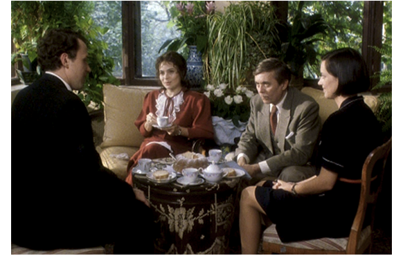 ダビデよりかなり年上の姉のヘドヴィカは、付き合っている医学生を、自宅に呼んで両親に会わせる。結婚相手として承諾してもらうためだ。しかし、優秀な医学生ということでちやほやされ、うっかり口を滑らせてしまう彼氏。「正直に言いますと、僕たち移住するつもりです。パレスチナへ」。彼氏はシオニストなのだ。父は、「娘を、君の新天地に連れて行くだと? 失望だ!」「我が一族はここに住んで永い。だから、君も住むのだ、ここに。ヘドヴィカは ここに留まる」「君が、娘を愛しているなら、従って欲しい。嫌なら、出てってくれ」。まさに最後通牒だ。この言葉に強く反発した彼氏だが、後でヘドヴィカから、「妊娠しちゃったの」と打ち明けられ、結婚せざるを得なくなる。結婚式、そして、宴会。それが済んで、母から余興として、ピアノを披露するように言われたダビデとソーシャは、代わりに今流行の歌だと自慢し、「ドイツ労働者党党歌」を歌ってしまう。実は、庭師のドイツ系チェコスロバキア人から、行進曲を希望し、教えてもらったのだ。帰宅して、庭師を叱り飛ばす父。「ナチのチンピラどもの歌を、ダビデに教えるとは! 何かの手違いだとは思うが、さもなくば、君は、即刻クビだ!」。庭師は謝ったものの、ドイツの影響が大きくなっていたご時世なので憮然とした表情だ。