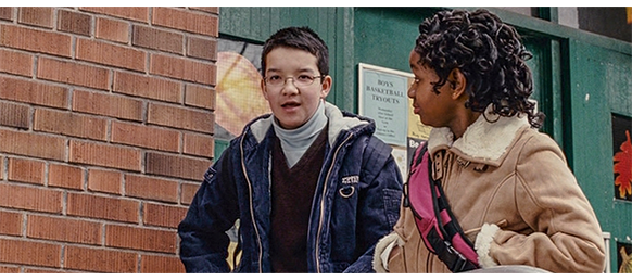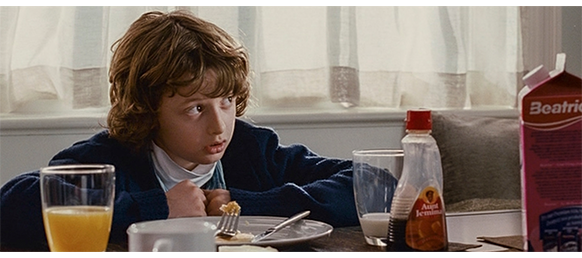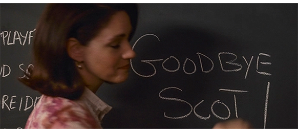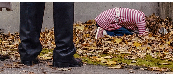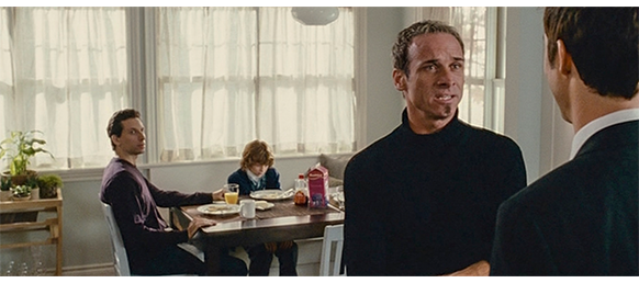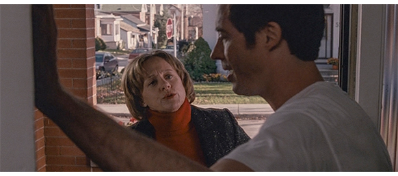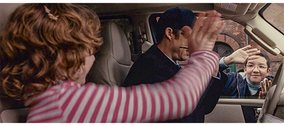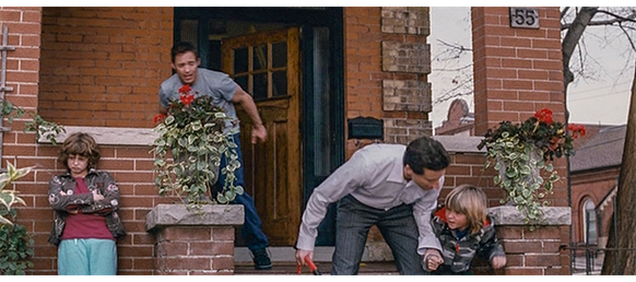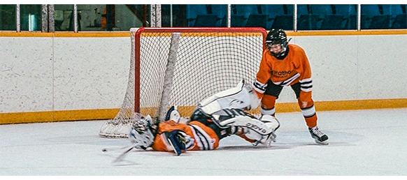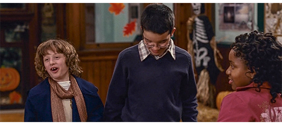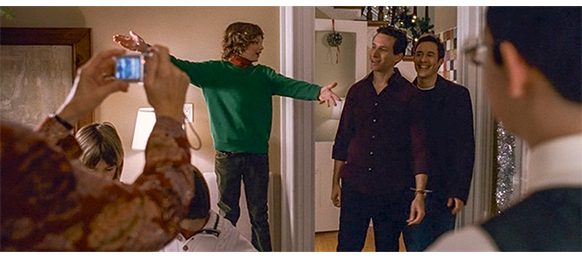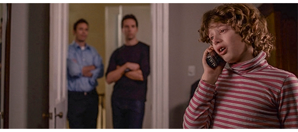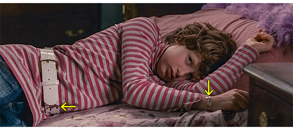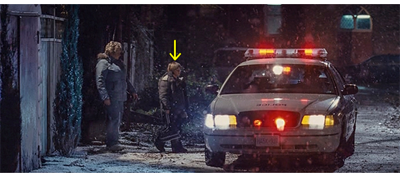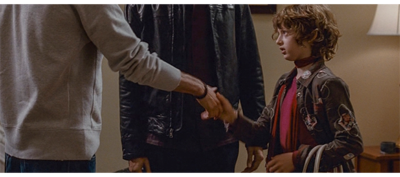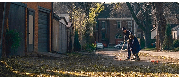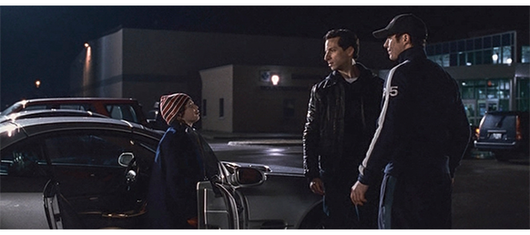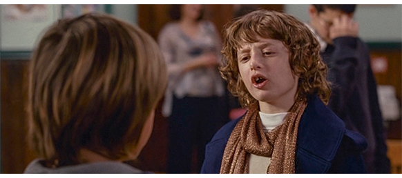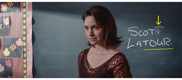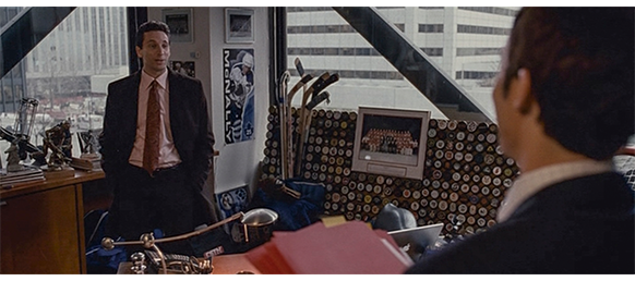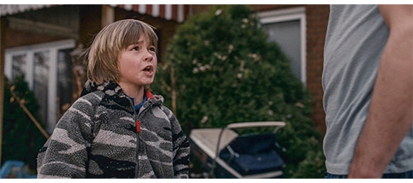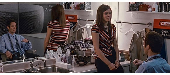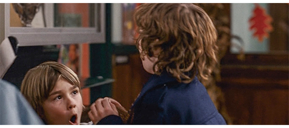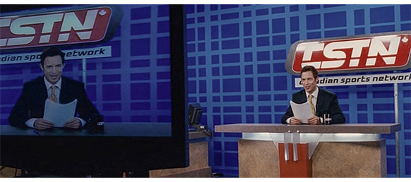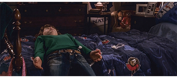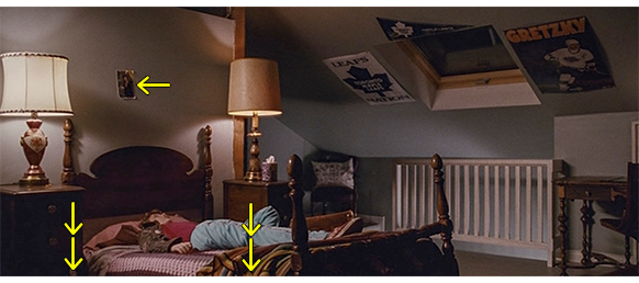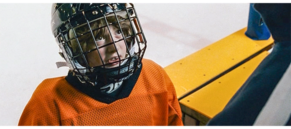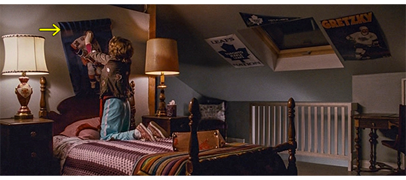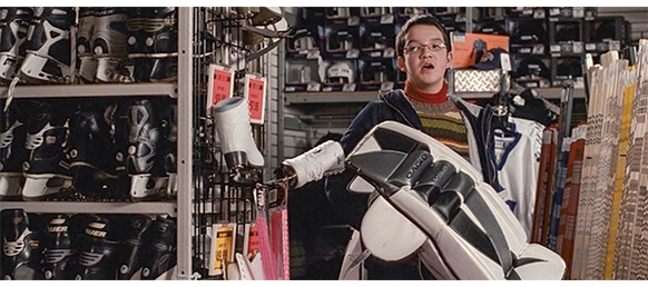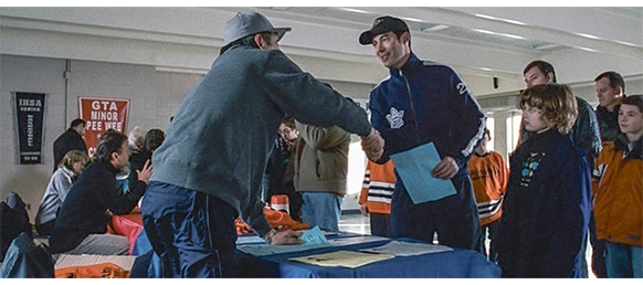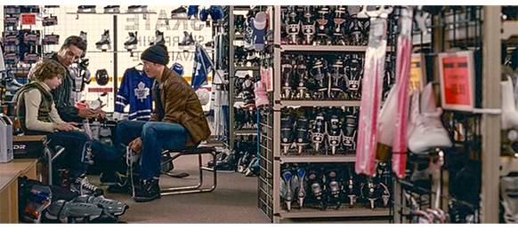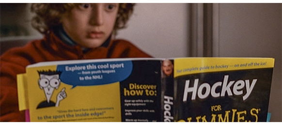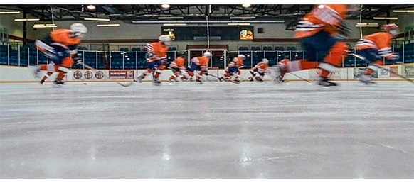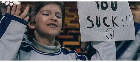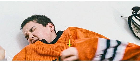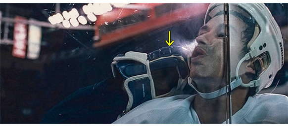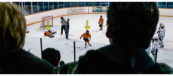 トロント・メープルリーフス〔カナダのアイスホッケーリーグ「NHL」に所属する7チームの1つ。1917年創設〕の紅白戦〔実戦形式のチーム練習〕が少年ファン向けに公開されている。選手たちが 観客席に設けられたアイス・エントランスから紅白二列になって出て来ると、子供たちが通路の周りに集まり、選手たちは声をかけたり、握手をしたりしてサービスする。しかし、一番人気のエリック・マクナーリだけは、1人の男の子が、「僕のヒーロー!」と叫びながら、写真入りのカードと、サイン用のペンを目の前に出すが、エリックはスティックの末端で邪険に払い除ける(1枚目の写真、矢印)。紅白戦が始まると、エリックは本番並みに荒っぽくぶつかって、次々と相手をリンクに倒していく。しかし、エリックが、パックを追ってアクリル壁で相手にぶつかった時、さっき邪険にされた少年が、「あんた、サイテー!〔YOU SUCK!〕」と書いた紙をアクリル壁に押し付け、「マクナーリ、あんたサイテーだ!」と何度も叫ぶ。それにエリックが気を取られていると、相手チームの1人が腹いせにボーディング〔相手が気づいていない、または防備できない状態で壁に強く押し付ける行為〕の反則で激突し、エリックの顔は思い切りアクリル壁にぶつかる(2枚目の写真、矢印は敵のショルダーパッド)。エリックがそのまま気を失って倒れていくのを、少年は「マクナーリ、ざまみろ!」と言いながら笑顔で見ている(3枚目の写真)。