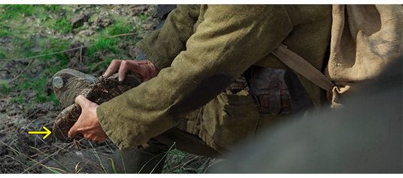 2人が、別の湿地との境界に着いた時、トトシュはボレルをやっつけるための策略を始める。ポールと “坊主” を上にやり、「ほら、そっちの乾いた方を歩くんだ。足跡を残さんよう気をつけろ」と指示する。そして、トトシュは湿地帯の上を足跡をわざと残しながら歩くと、近くの石の上に座り、ポールに 「これは、”騙し靴” だ」と言いながら、二重底になった靴底の下の部分を回転させる(1枚目の写真、矢印)。この状態で歩くと、泥に付いた足跡は、歩いたのと逆向きに付く。両足とも逆さまにした後、トトシュは意図的に歩き回る。それを見たポールが、「ボレルは、またあなたのせいにする」と言うと、「その通り」と応え、ポールはニッコリする(2枚目の写真)。そのあと、ボレルが、湿地についた沢山の足跡を見て 興奮するシーンがある。そして、やったとばかりに、食堂で雉を食べている2人の警官のところまで行くと、湿地で見つけた罠も見せ、「トトシュを捕まえたよ。この2つの罠は奴のもんだ。足跡だって残っている」と売り込む。「いつもそう言うが…」。「違う、違う。ぬかるんだ土だから、足跡が消えることはない。これで、奴を逮捕だ!」。そして、3人は湿地まで来る。しかし、うかつなボレルは、足跡に興奮しただけで、ちゃんと調べた訳ではなかった。だから、警官の前で、「変だな… 奴が、どっちに行ったのか分かん」という始末。警官は、「現行犯で捕まえない限り、私たちには何もできん」と、お粗末なトトシュをバカにしてニタニタしている(3枚目の写真)。