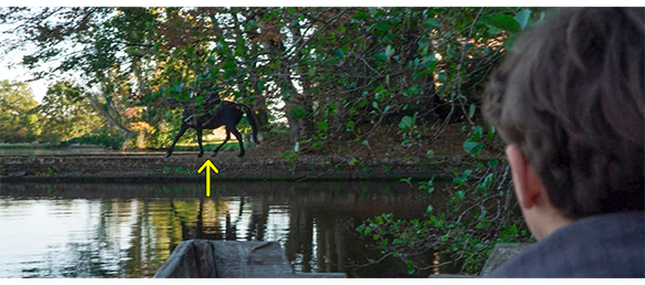 そのあと、セレスティーヌが城に向かうために制服を着て、エプロンをポールに結ばせながら、「急いで、早く行かなきゃ。屋敷で仕事が待ってる」と急かす。ポールが、「俺も一緒に行く」と言うと、セレスティーヌは、「ダメよ。伯爵は子供が好きじゃない。彼が来たら、逃げなさい。いい?」と、城以外で会った時の注意をする〔顔も知らないのに、どうやって逃げられる〕。「一人で何すればいいの?」。「好きなようにしてて」。「散歩に行ってもいい?」。「もちろん」。生まれて初めて大自然の中に入って行くことを許されたポールは、洗濯物の前で、じっと森を見つめる(1枚目の写真)。ここから、カメラは、広大な森を美しく描いていく。そこでは色々な動物が、自由気ままに動き回っている(2枚目の写真、矢印)。かなりの時間が経ち、ポールが家に戻ると、セレスティーヌは城から戻っている。セレスティーヌと一緒に、森の中の道を歩きながら、ポールは、「トトシェって、どんな人?」と訊く。「誰から聞いたの?」(3枚目の写真)。「旦那さんのボレル。流刑地送りにしたいって言ってた」。「あの2人… 犬猿の仲なの。トトシェは悪者じゃない。彼はただ… 何て言えばいいのかしら? 自由。それね。彼、ホントに自由なの。決められた通りにしか行動しないボレルとは大違い」。「密猟者だって」。「ソローニュではみんなそうしてるし、容認されてる。日々の生活を良くしないと。この土地は貧しいから」。2人がロワール川まで来ると、セレスティーヌは 「あれが彼の家よ」と教える。「家なんかないよ」。「ええ、船があるでしょ。林のそばの窪みの中」(4枚目の写真、矢印)。