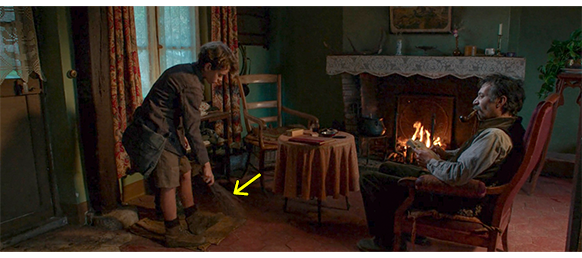 伯爵は、さっそく調理室に行き、そこで働いているセレスティーヌと、同僚の女性に、「ここをうろついている少年は誰だね?」と訊く(1枚目の写真)。すぐにピンと来たセレスティーヌは、「バカンスで来ているパリっ子です。もう ご迷惑はおかけしません」と謝る。「あの無口の子の名前は?」。「ポール・ラカサーニュ。私のいとこの甥の息子です」。伯爵は、「そうか」と言って出て行く。城を逃げ出したポールが、どこに行ったのかは分からないが、夕方になって家に戻ってくる。ドアの横で、靴に付いた泥を、細い枝のようなものを束ねた “はたき” で払っていると、ボレルが、「こんな時間まで どこにいた?」と訊く(2枚目の写真、矢印)。ポールが黙っていると、「親爺は礼儀作法を教えんかったのか?」と批判する。ポールが、「父さんは戦争で死んだ。放っといて」と反論すると、ボレルは立ち上がり、ポールの胸を掴むと、「何だと?!」と怒鳴るが、そこにセレスティーヌが」割って入り、夫を止める。そして、ポールに対しては、「あんたは、お屋敷をうろつくんじゃない」と叱る(3枚目の写真)。ボレルは、「気に入らんのなら、パリに帰りゃいいんだ」と言った後で、「あいつの親爺は戦争で死んだのか?」と訊く。「そうよ。可哀想に」。「ラカサーニュは除隊になったって言ってなかったか?」。この危機的な質問に、セレスティーヌは、とっさに、「あなた、私の “甥のいとこ” と勘違いしてますよ。あの子は、私の “いとこの甥” の子です」と誤魔化す。